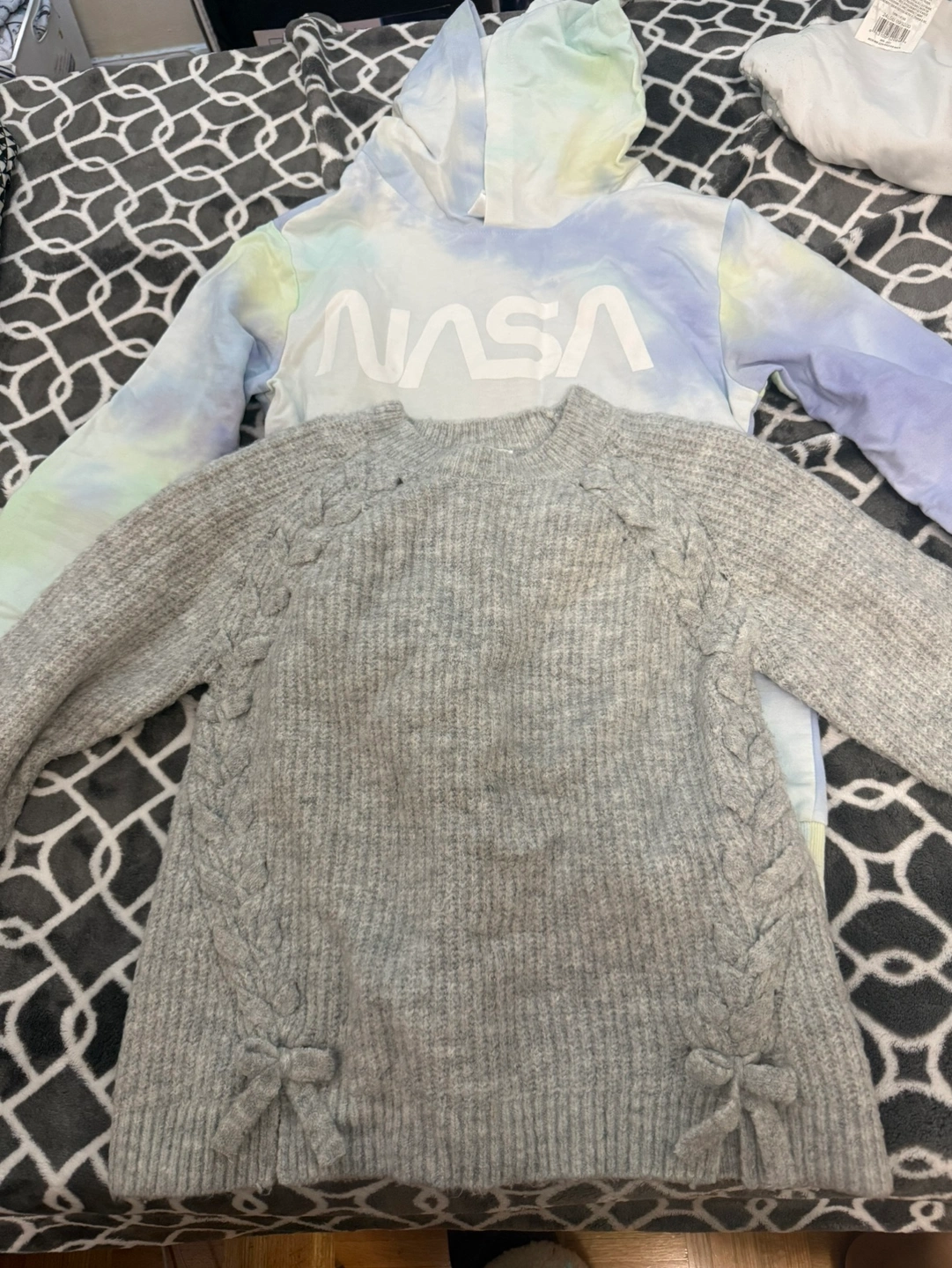 758Girls' bundle includes a NASA logo tie-dye hoodie and a Zara grey cable knit sweater. Soft material, comfortable fit. Perfect for layering.