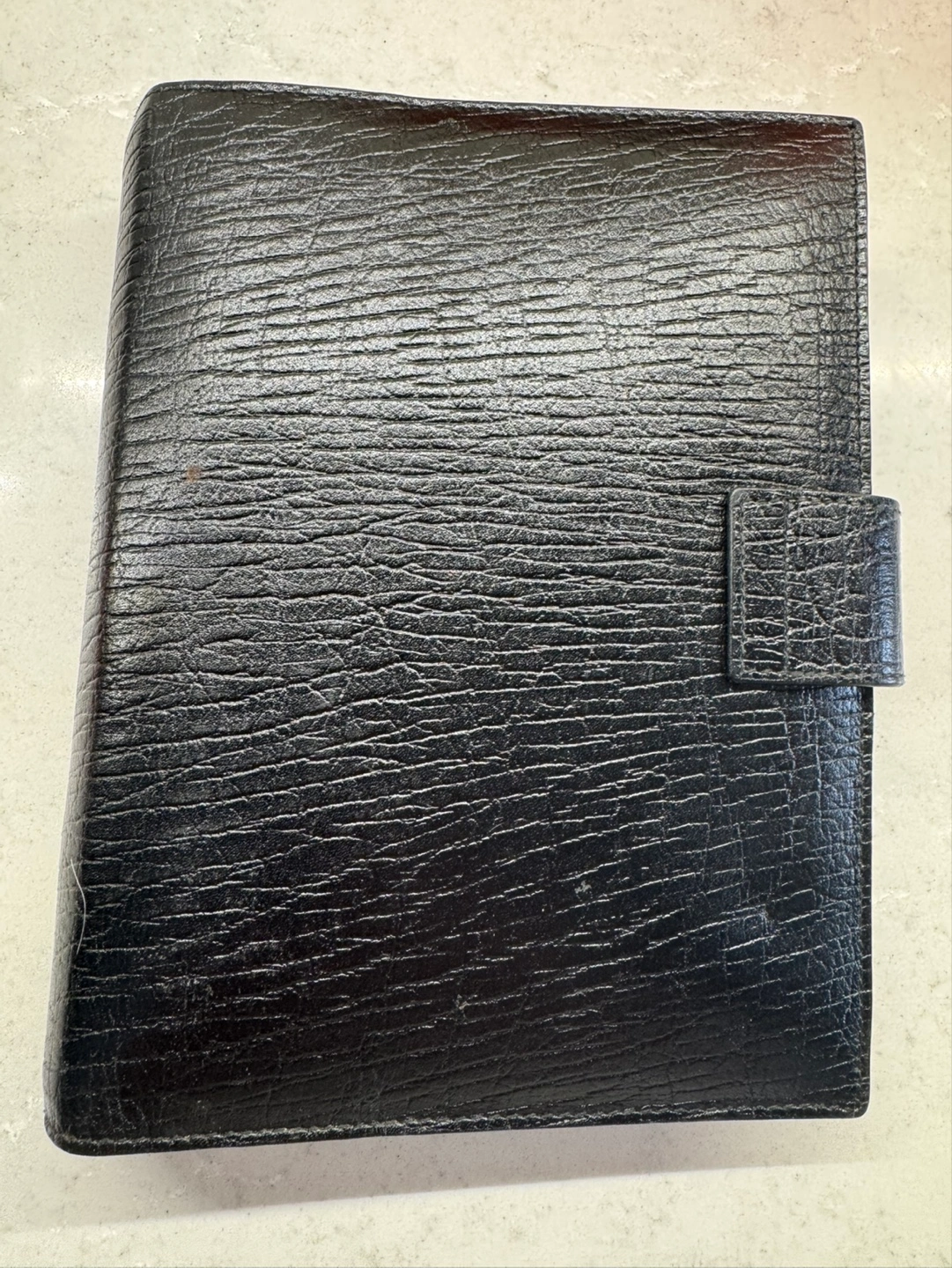 Black leather-bound organiser. Features multiple pockets and binder rings. Suitable for bills, phone and cards. Silver-toned hardware. Gucci branding visible. Authentic and purchased in Italy