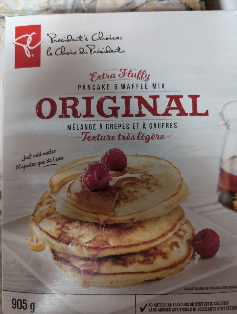 905g box of President's Choice Extra Fluffy Original Pancake & Waffle Mix. Just add water. No artificial flavours or synthetic colours.