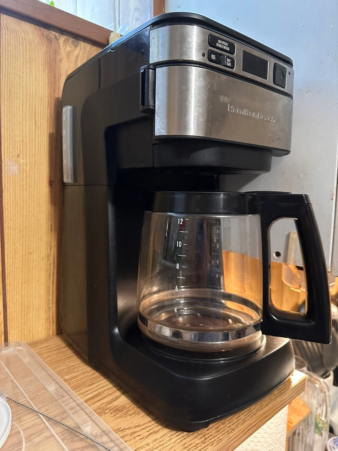 Programmable coffee maker. Features a glass carafe and digital controls. Black and stainless steel design. Works great, never had any issue.