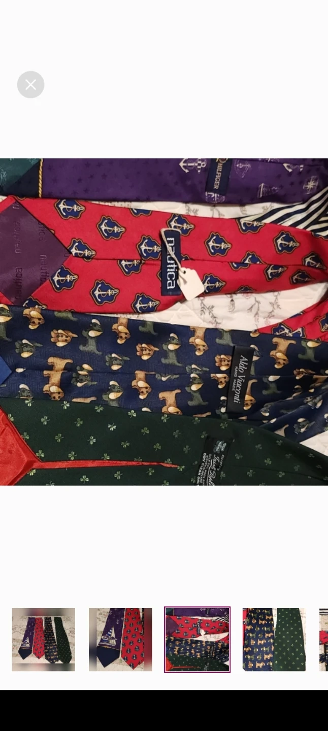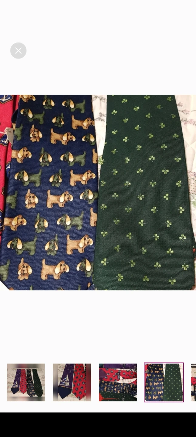 A collection of four men's neckties, including one from Nautica with anchors and one with a sailboat design. The other ties feature dog and shamrock patterns. These ties are made of silk and polyester blends.