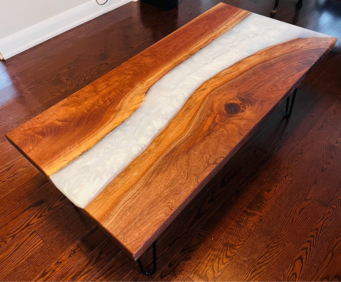 This exquisite epoxy coffee table combines high-quality epoxy with air-dried Lucky Walnut wood. The white epoxy beautifully contrasts with the walnut's natural grain, while the plant-based oil finish enhances its artistic and unique charm. It is mounted on durable, powder-coated metal legs, secured with M4 15 screws.