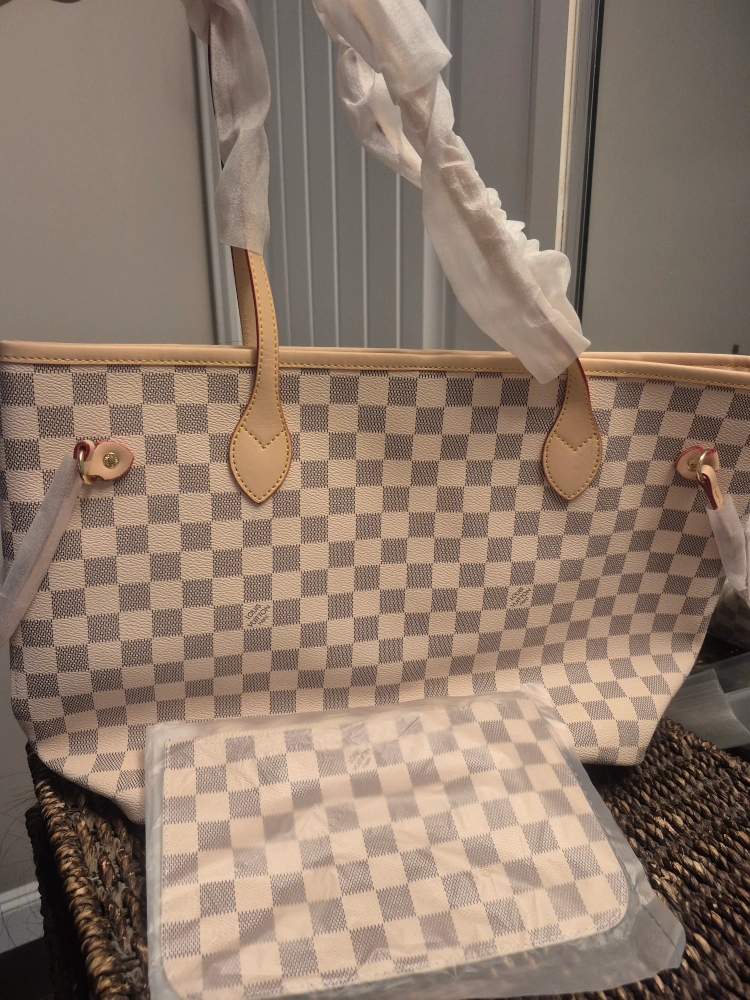 Inspired Louis Vuitton Neverfull MM tote bag. Classic Damier Azur canvas. Includes dust bag. Large capacity. Perfect for everyday use.