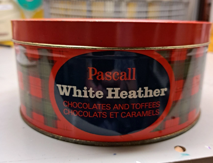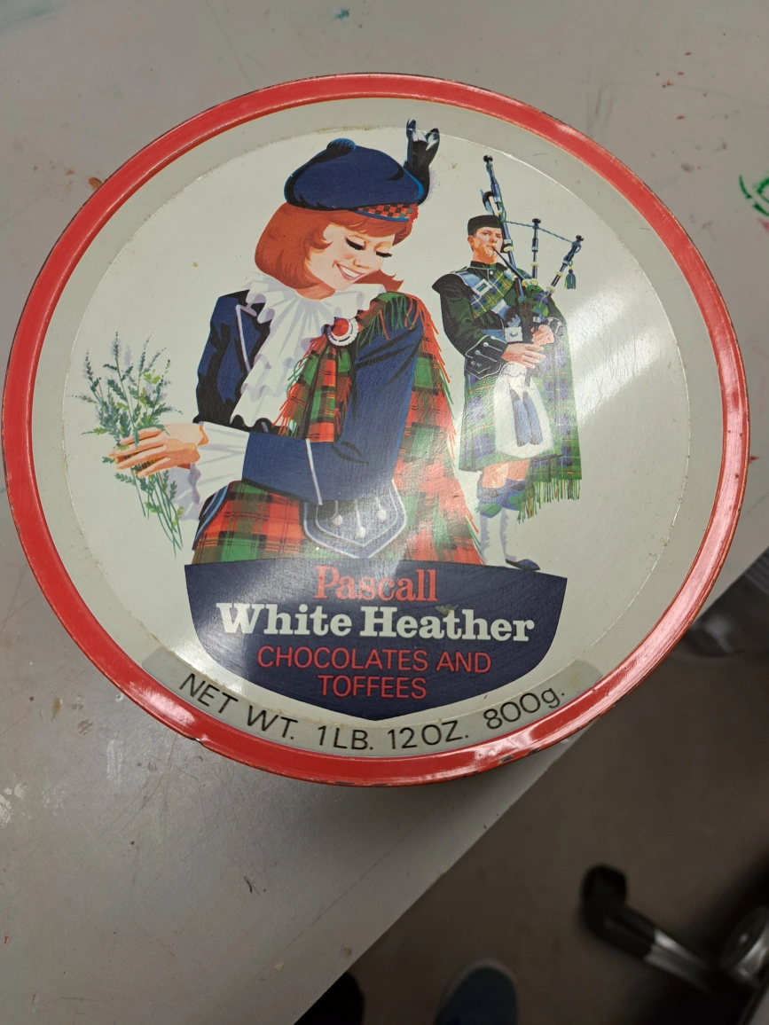 Empty vintage tin. Pascal White Heather brand. Chocolates and toffees. Red and green plaid design. Features a girl and bagpiper. Net weight 1 lb 12 oz (800g). Collectible.