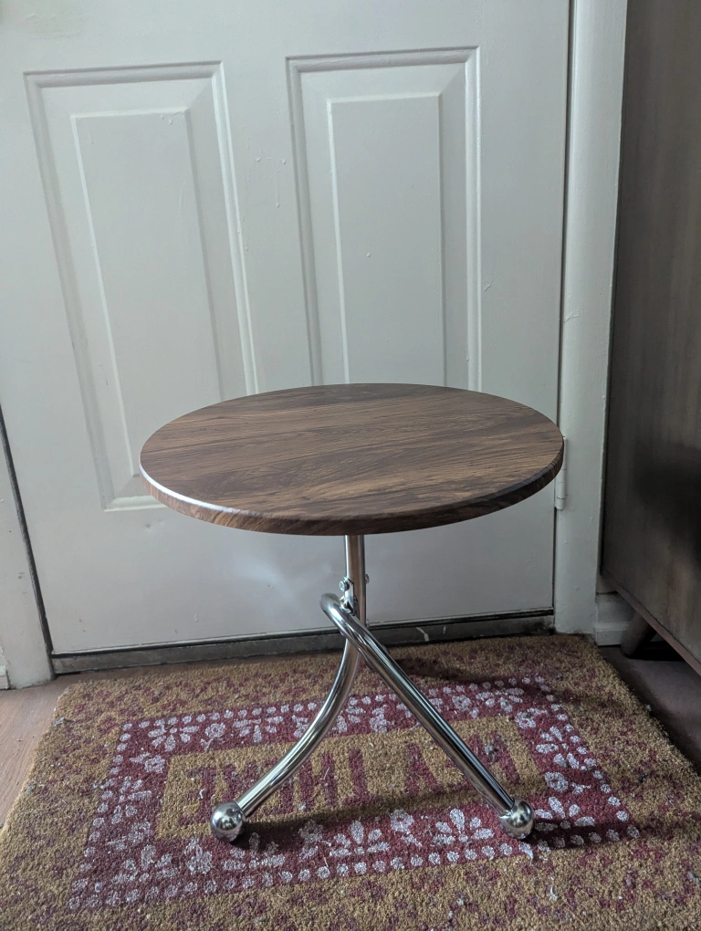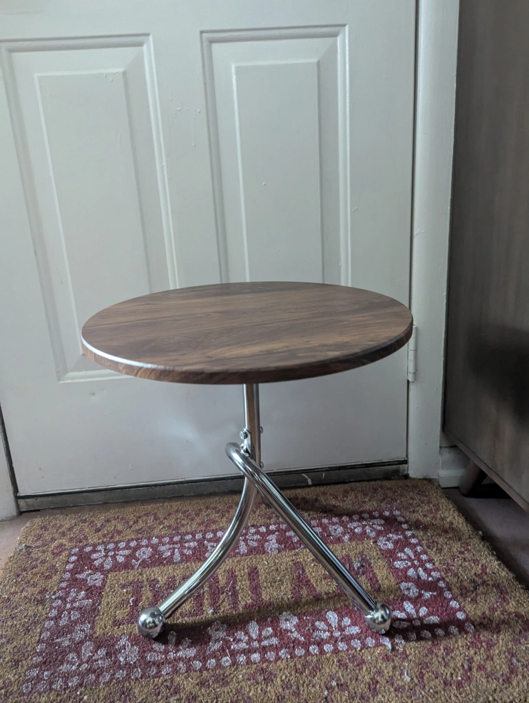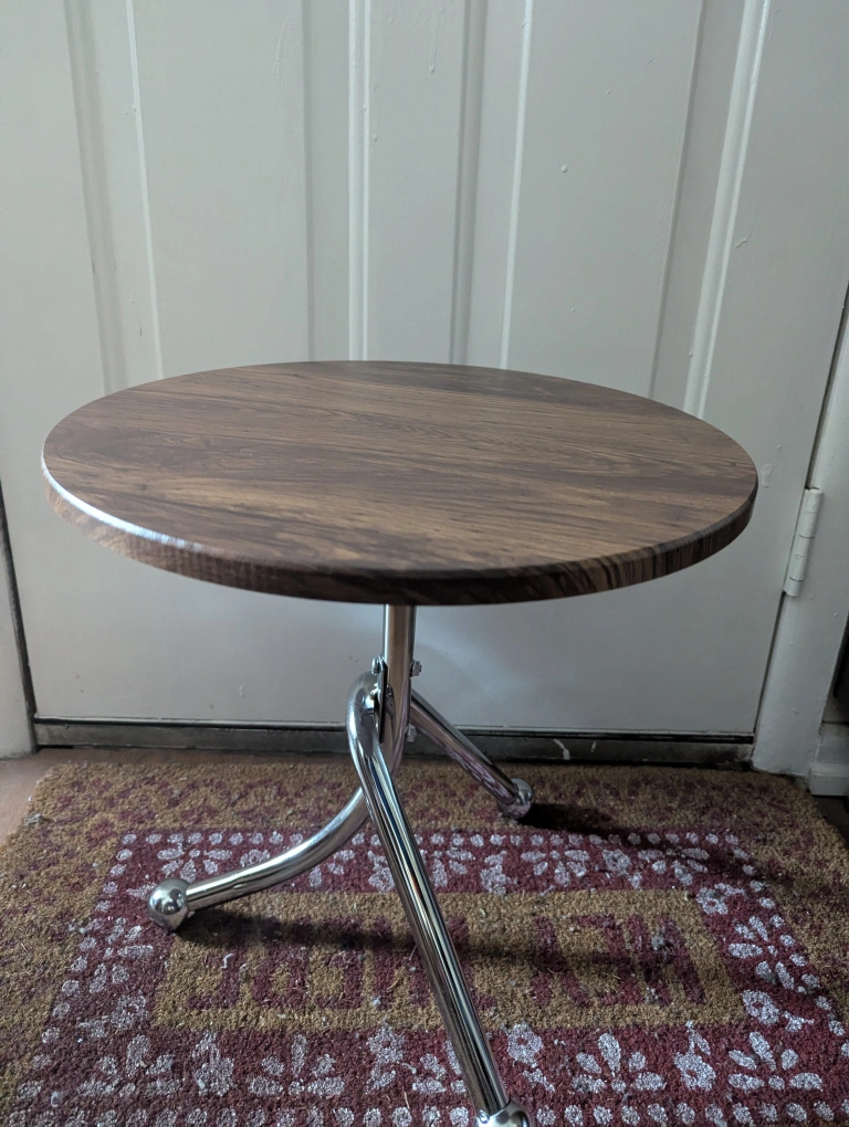 New Small round table. Chrome legs. Wood top. Perfect for small spaces. Unique design.