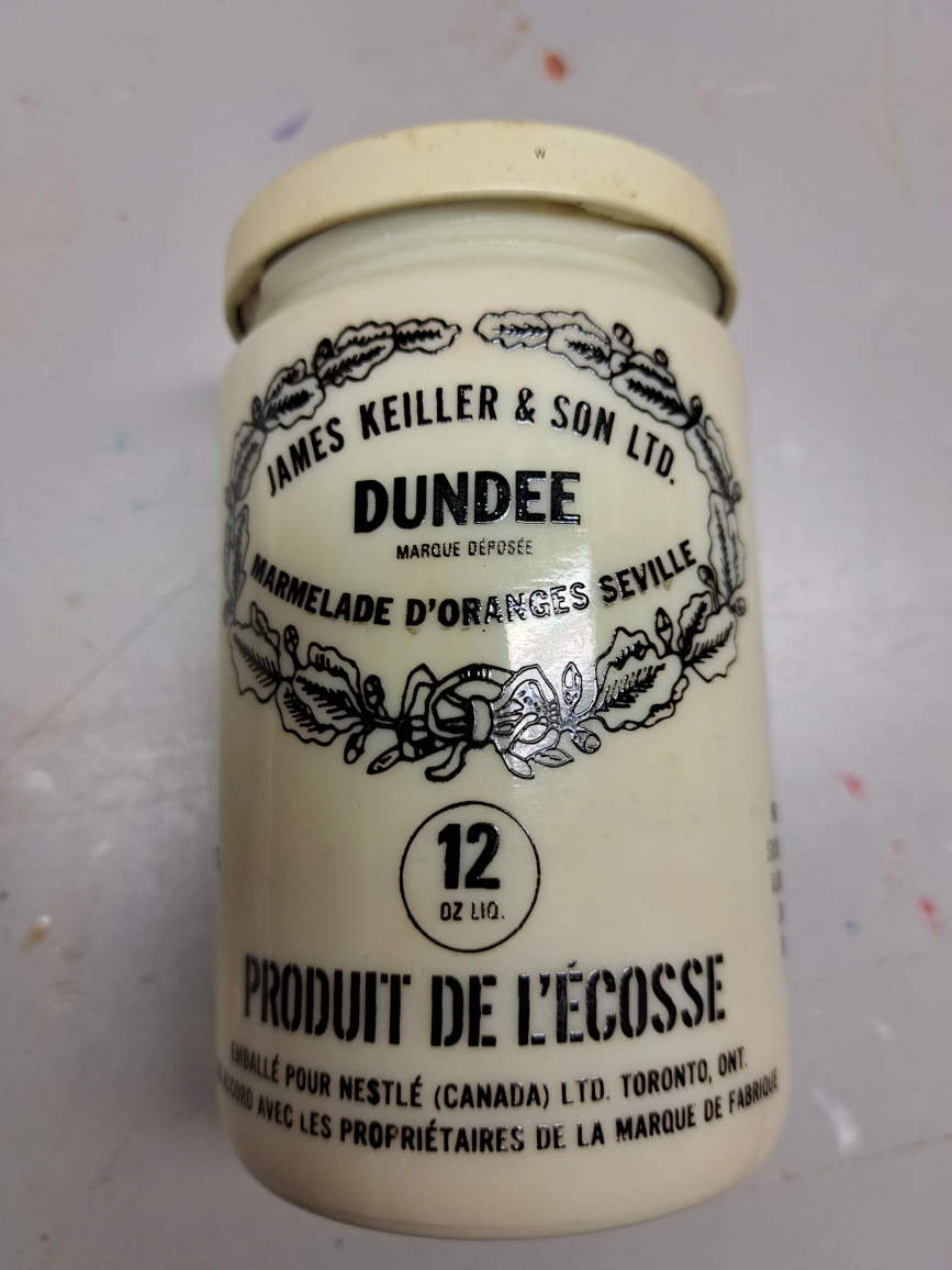 Vintage Dundee Marmalade jar. 12 fl oz. Product of Scotland. Packed for Nestle (Canada). Cream coloured ceramic jar with black lettering.