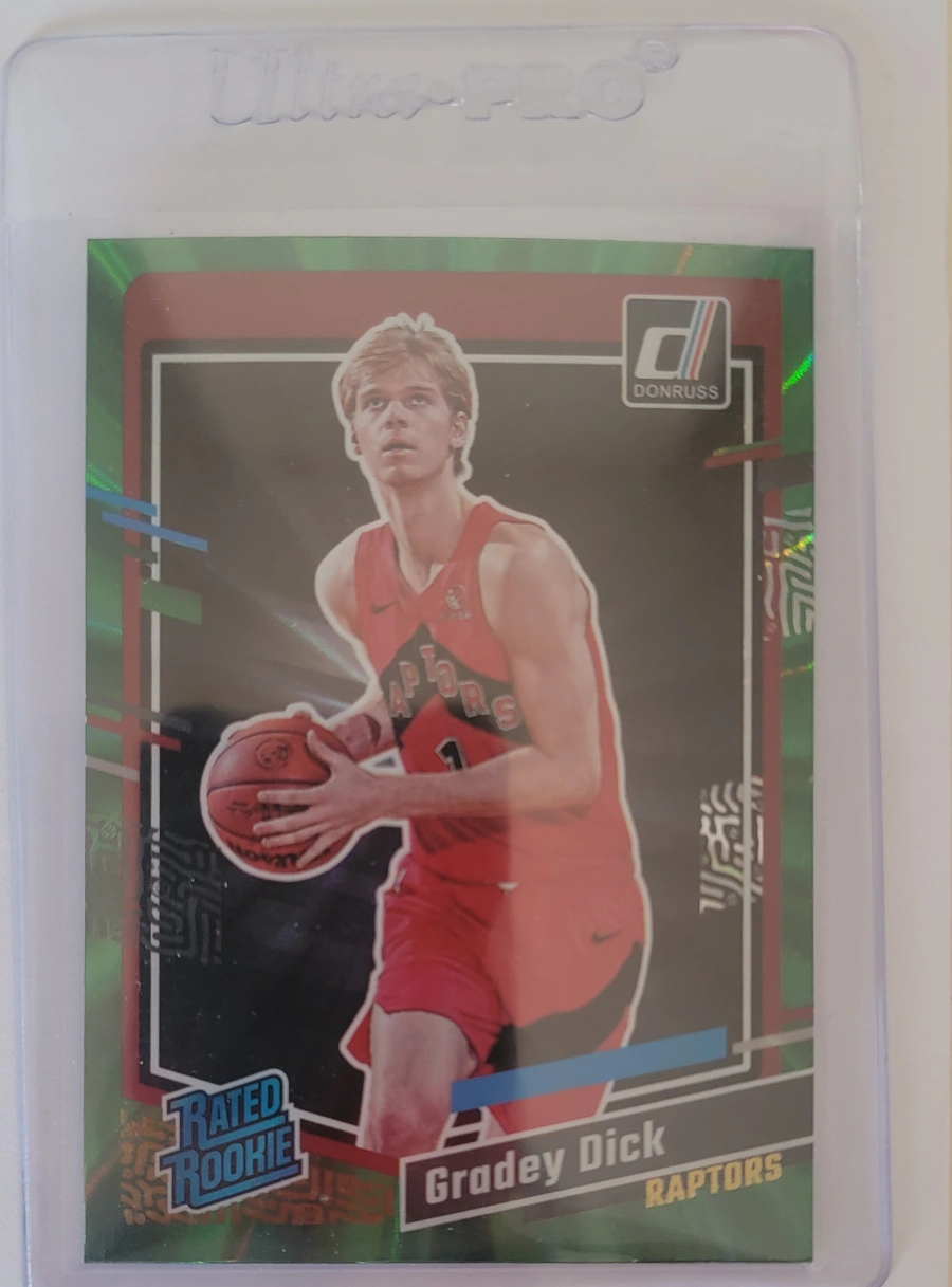Gradey Dick rookie card. Donruss Rated Rookie parallel. Card number 247 of 247. Toronto Raptors.