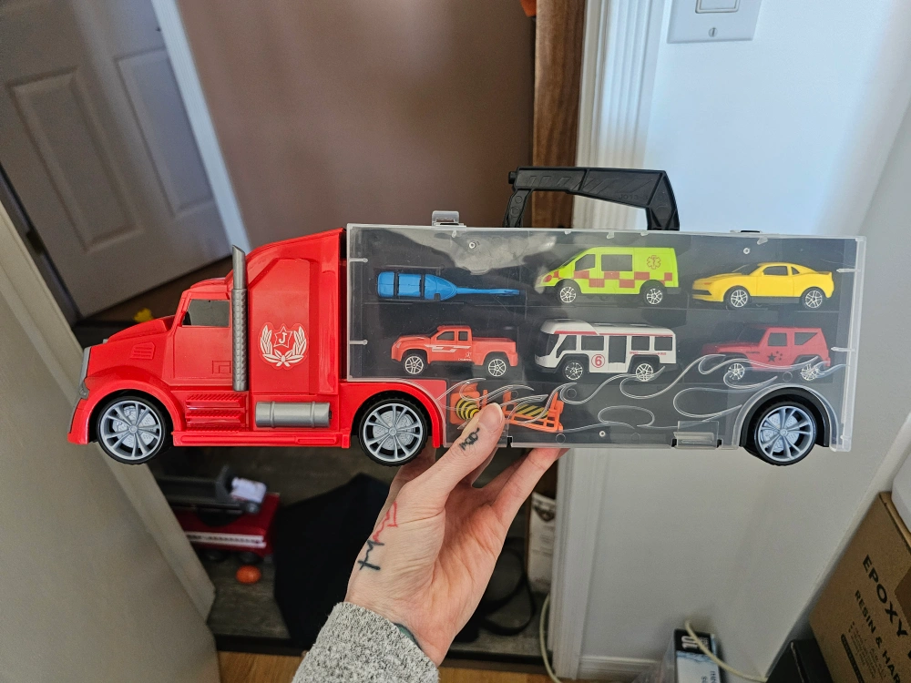 Red toy carrier truck. Includes several smaller toy vehicles. Clear plastic carrier. Great for kids. One side has cars and the other side is empty for your own cars