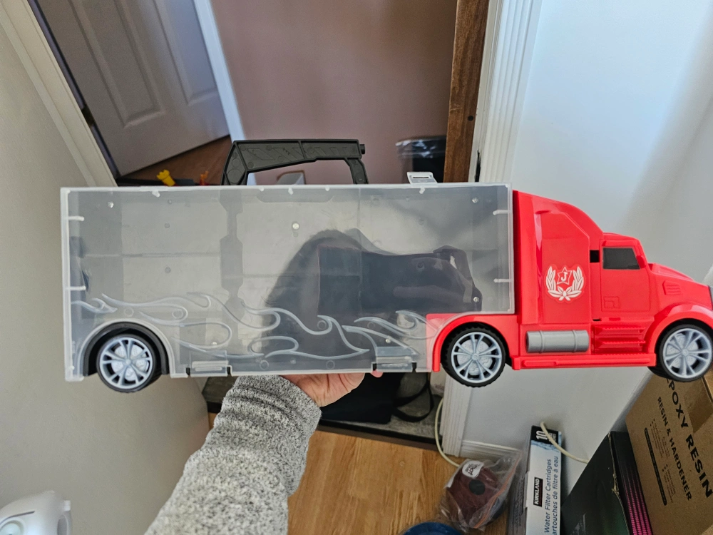 Red toy carrier truck. Includes several smaller toy vehicles. Clear plastic carrier. Great for kids. One side has cars and the other side is empty for your own cars