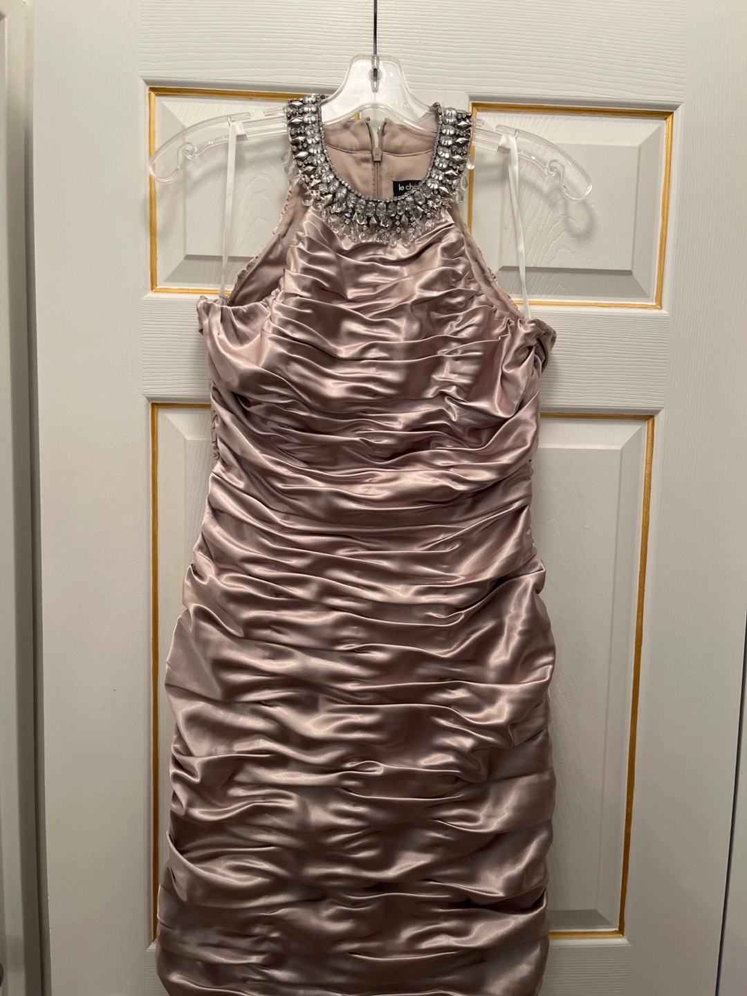 Stunning champagne-coloured mini dress. Features a halter neck and beautiful rhinestone detailing. Ruched bodice. Back zipper closure. Size 8.