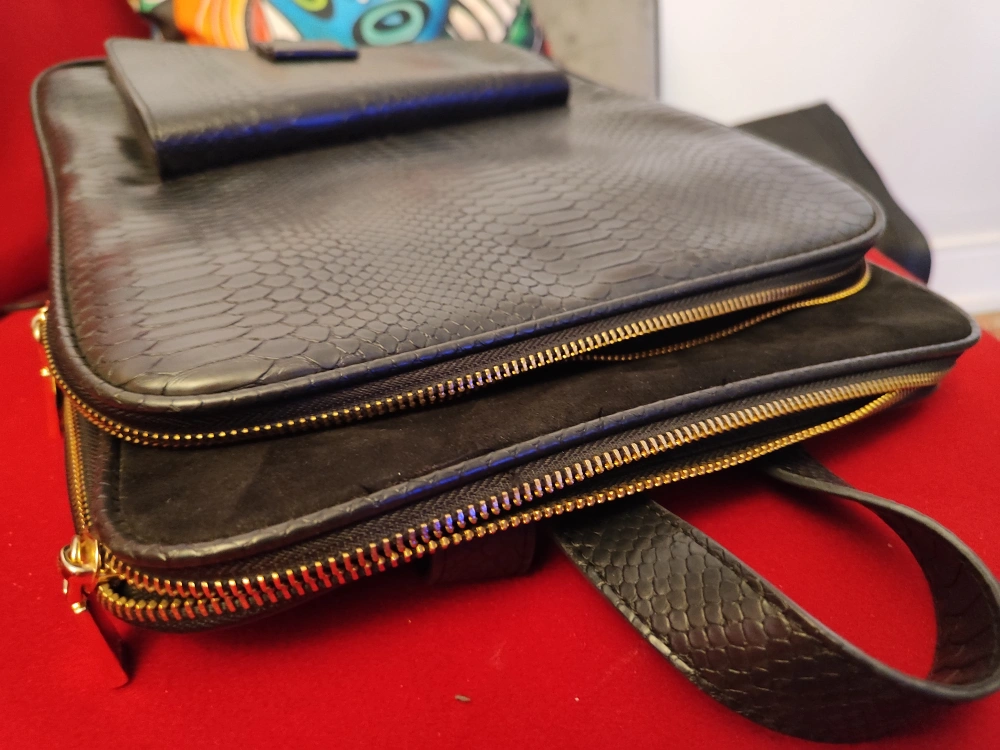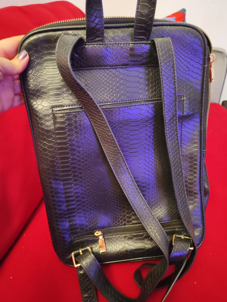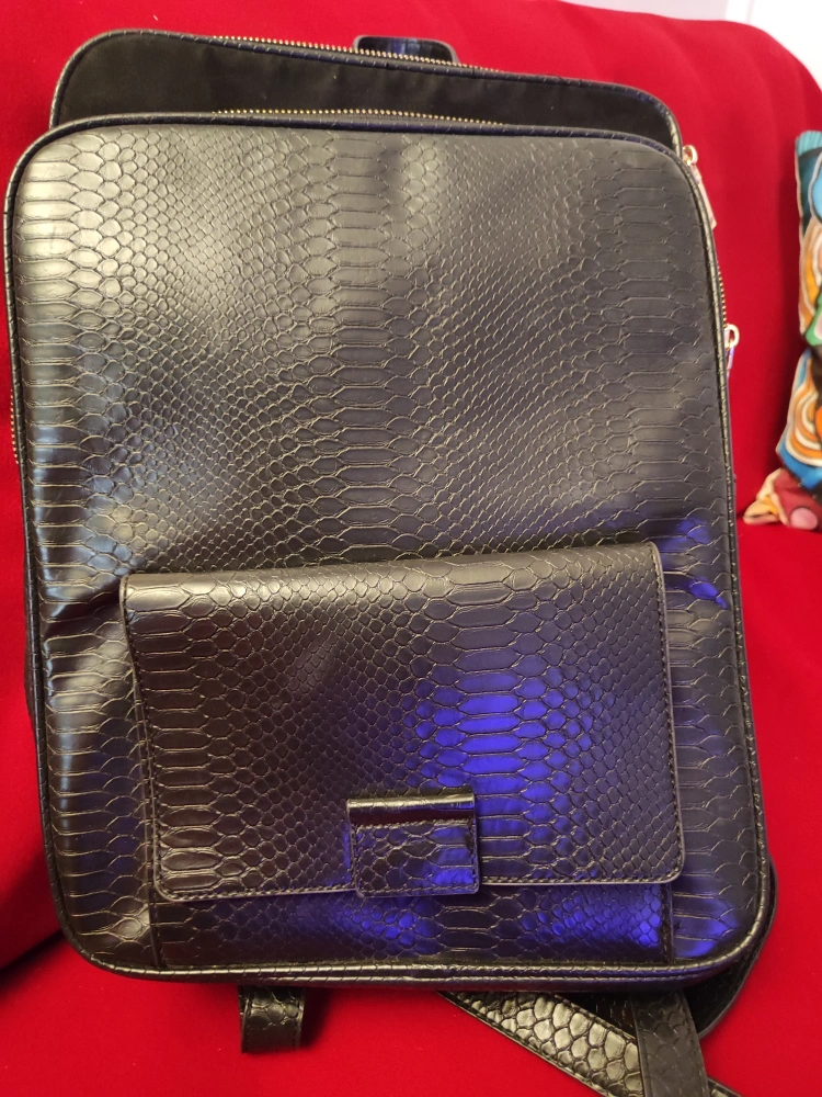 Stylish Parfois black backpack, snakeskin pattern. Features a laptop sleeve and multiple compartments. Gold zippers and hardware. Adjustable straps.