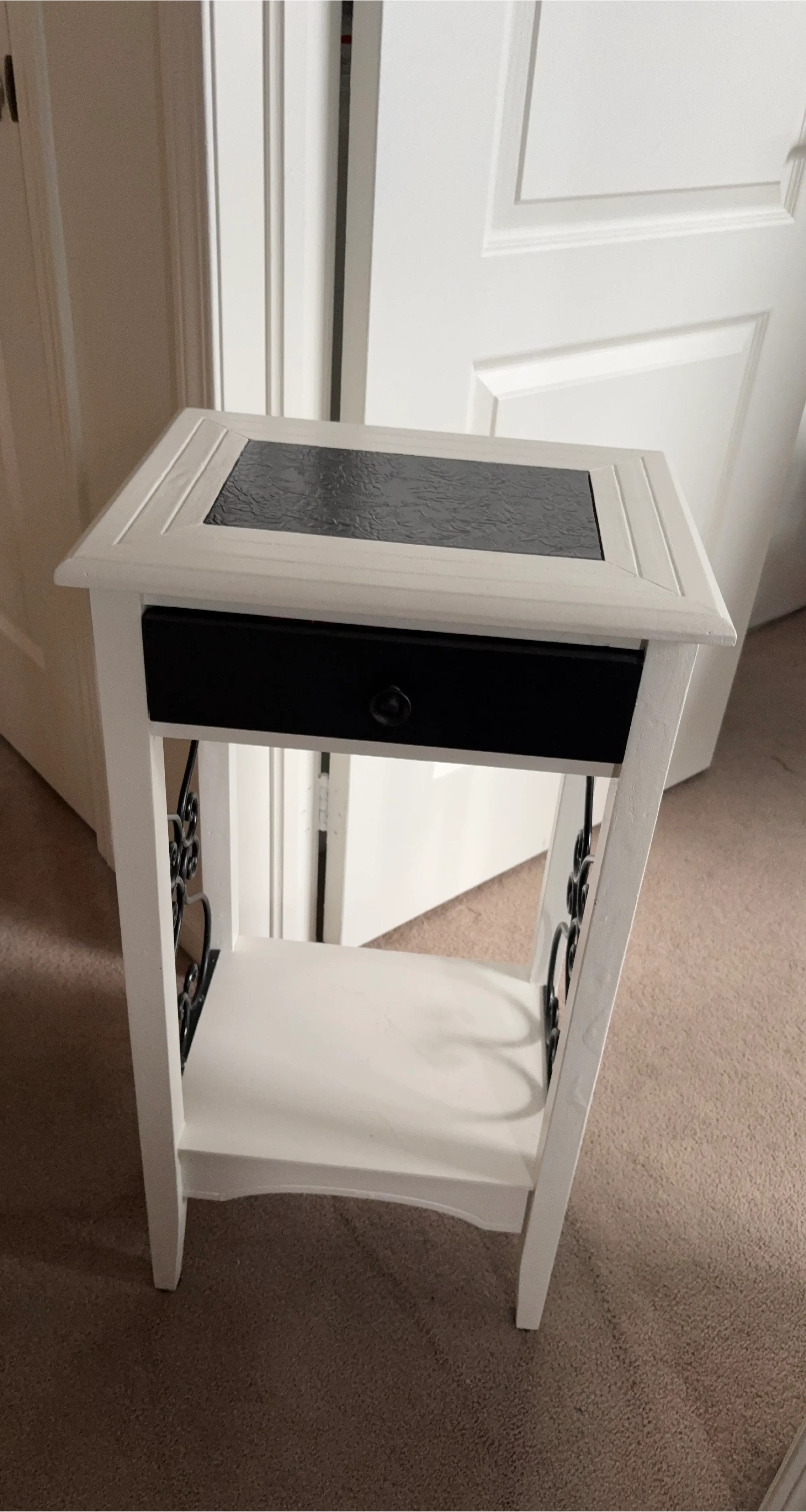 This accent table features a white finish with a black drawer and decorative scrollwork on the lower shelf. It's perfect for placing next to a sofa or chair. The drawer offers convenient storage.