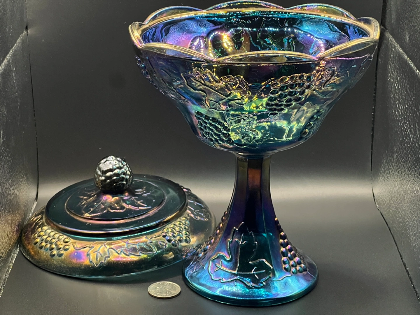 Beautiful iridescent peacock blue carnival glass candy dish.
