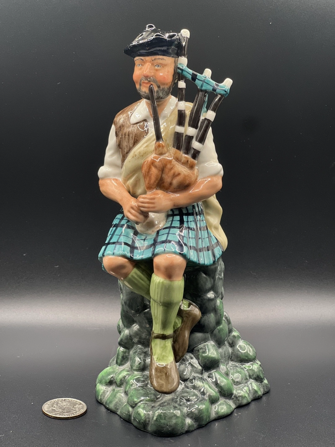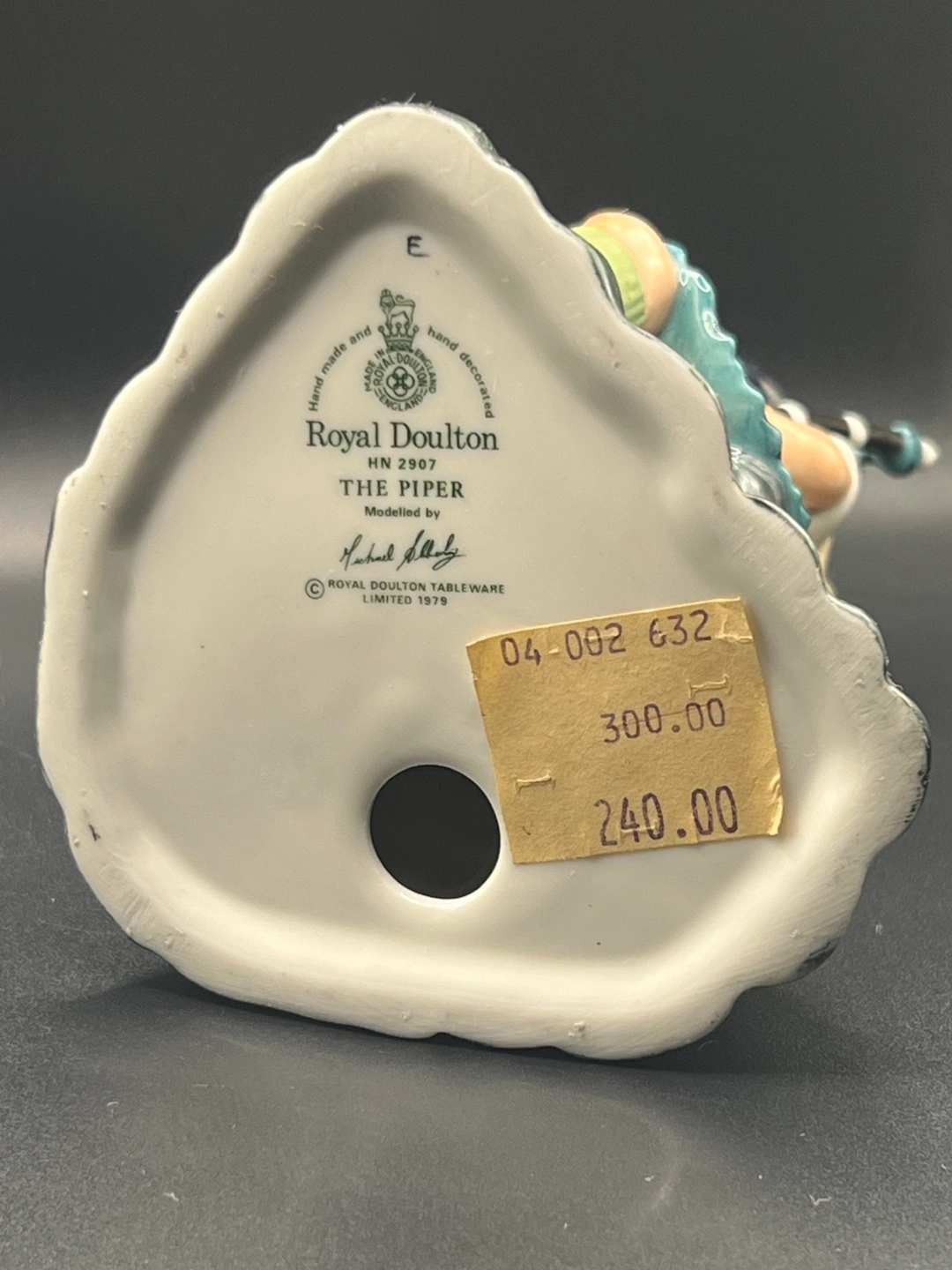 Royal Doulton figurine called "The Piper," model number HN 2907. Designed by M. Abberley. Made of fine bone china and produced from 1980 to 1992. The figurine is approximately 8 inches tall.