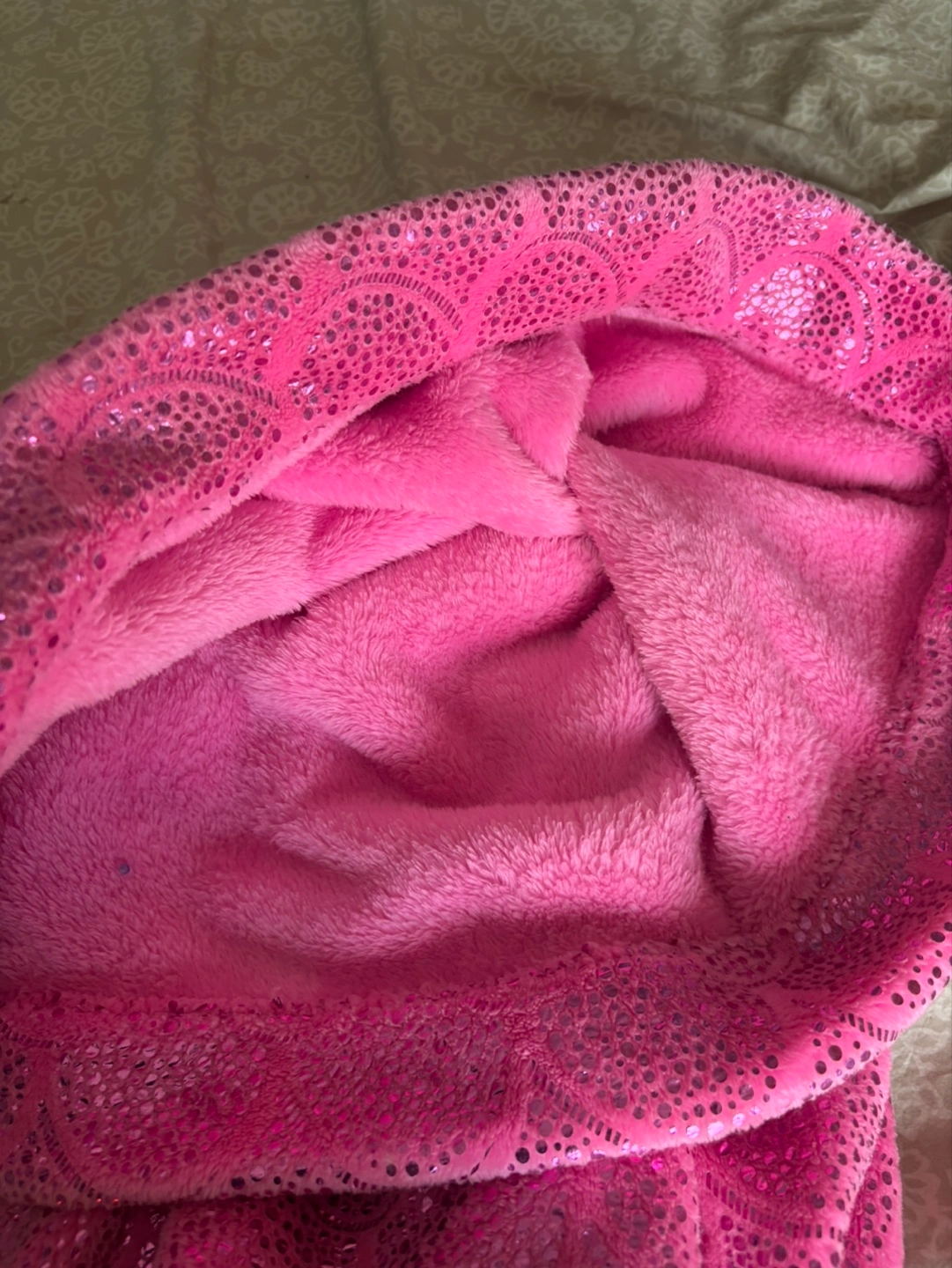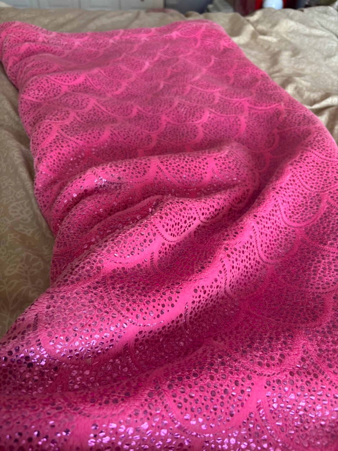 Cozy pink mermaid tail blanket. Features a sparkly scale pattern. Perfect for snuggling. Designed for kids but I used it comfortably as a 5’ 9” adult! haha