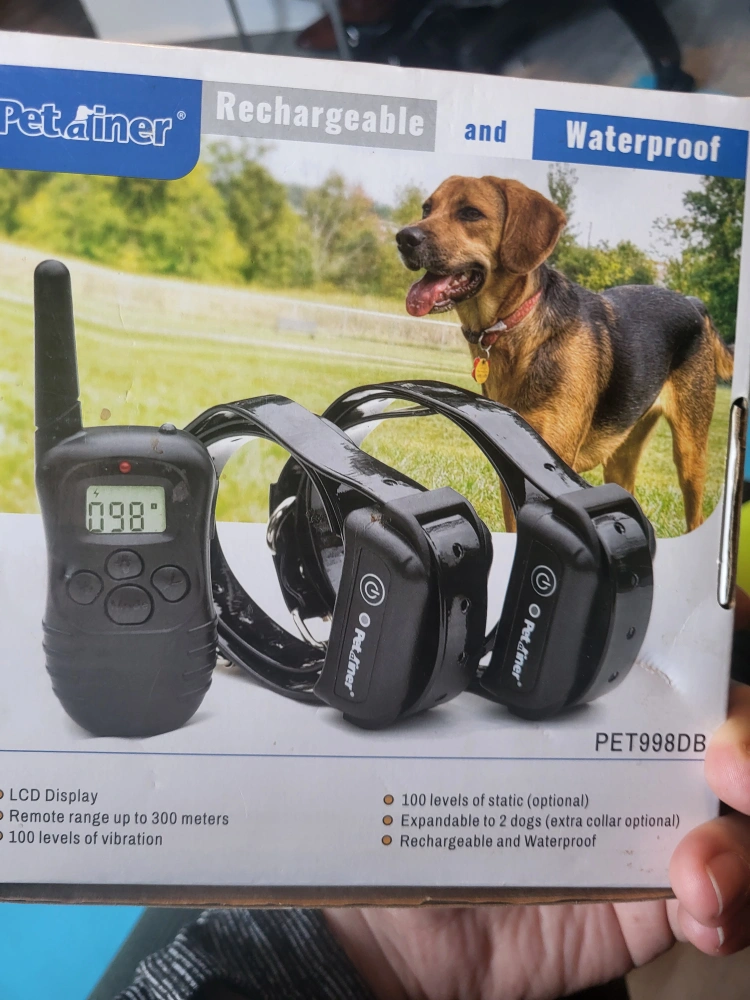 Includes remote, two collars, Features LCD display, 300-meter range, vibration, static shock, and tone options. Rechargeable and waterproof. Needs new charger lost when we moved.