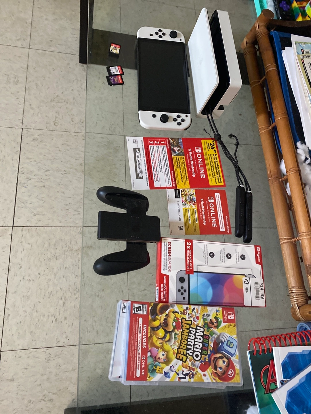 White Nintendo Switch OLED console, Joy-Con controllers, game (Super Mario Party Jamboree), screen protectors, and 12-month Nintendo Online membership included. Extra game cartridges.
