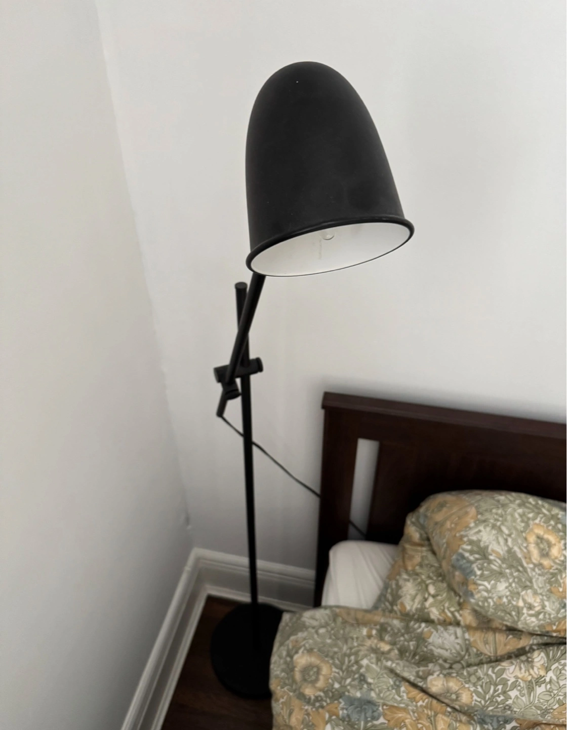 Slim and modern black floor lamp with an adjustable head and arm — perfect for focused reading light or adding ambiance to any room. The matte finish blends in with any decor style. In great working condition with bulb included.