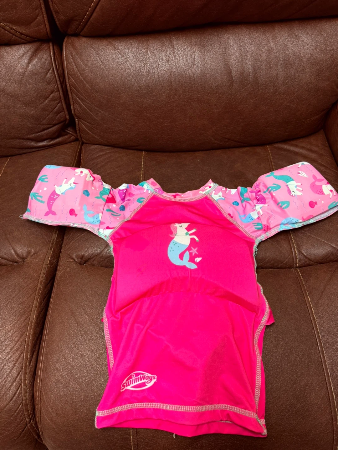 This SwimWays swim vest features a fun mermaid design. It's designed to help children learn to swim. The adjustable strap and buckle ensure a secure fit.