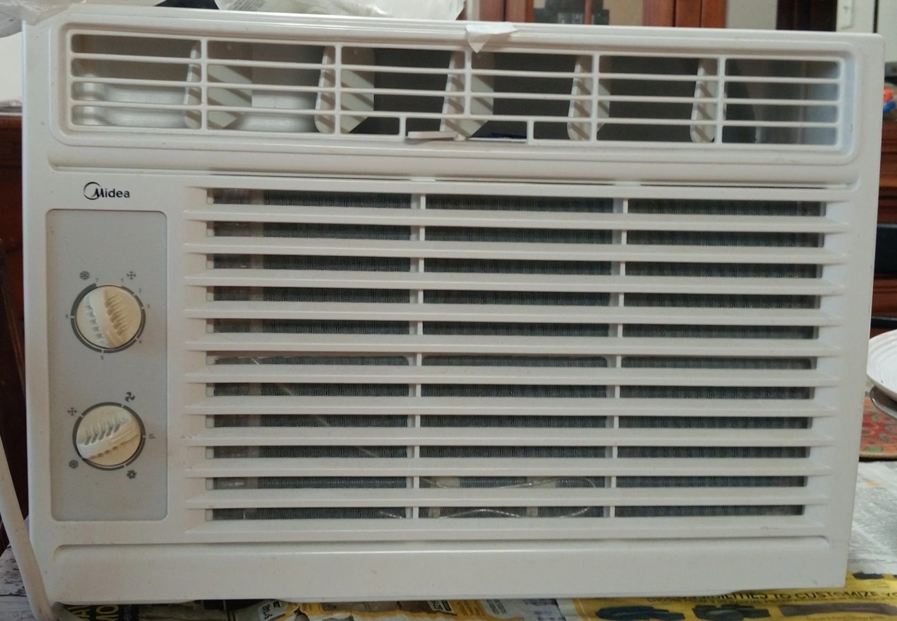 Used window air conditioner. Features adjustable temperature and fan speed controls. Off-white colour.