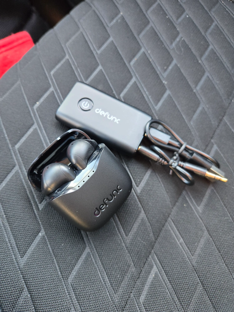Wireless earbuds and charging case. Includes charging cable. Compact design. Portable.