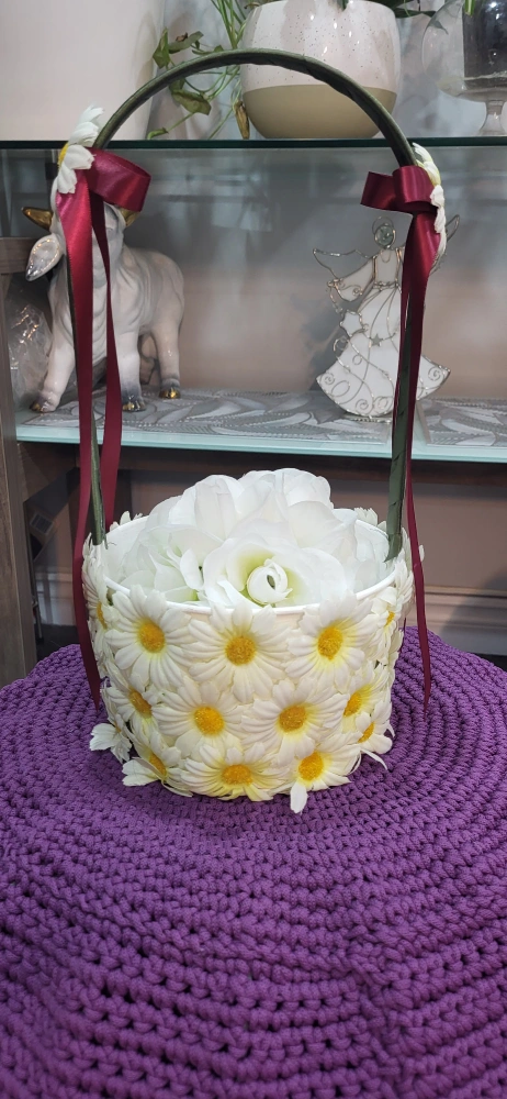 Adorable flower girl basket. Features a dark red ribbon and is decorated with white daisies. Holds a bouquet of artificial white flowers.