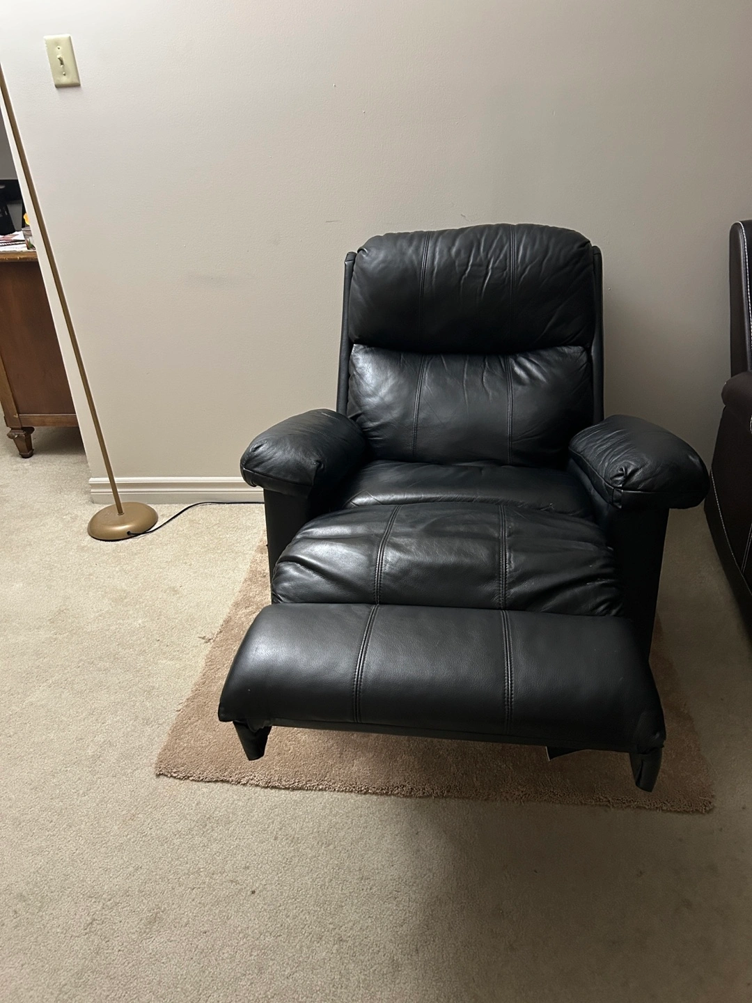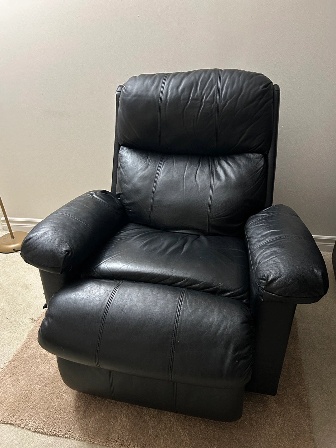 Comfortable black leather recliner. Manual Reclining mechanism. Good condition. Perfect for relaxing.