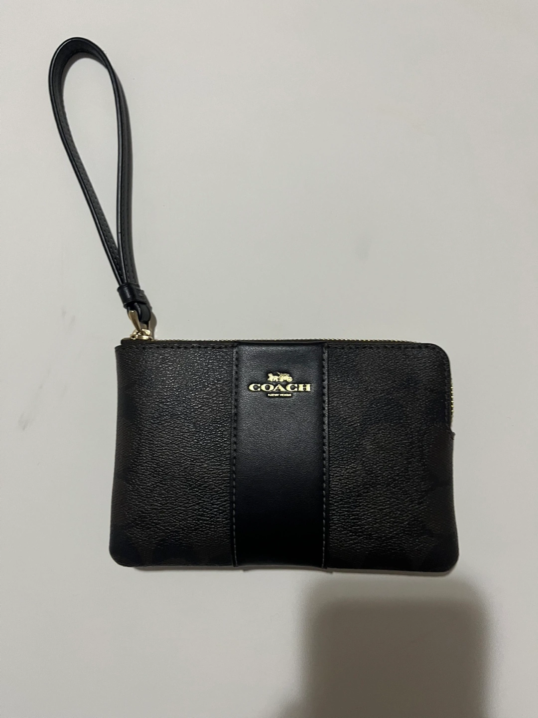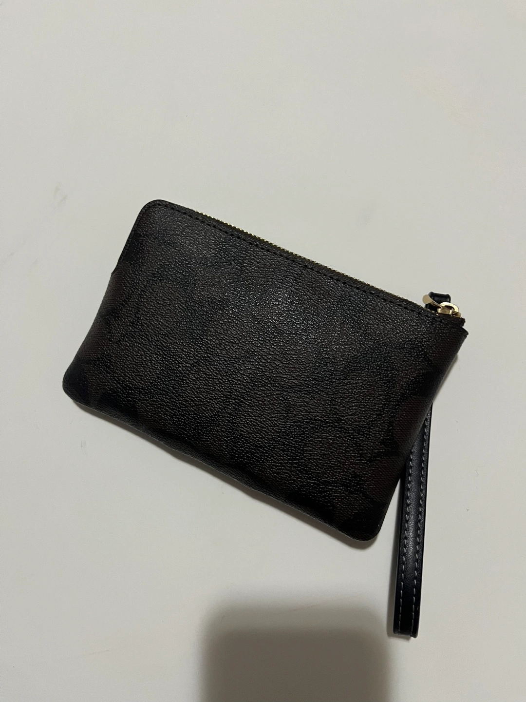 Brown and black Coach wristlet. Zip closure. Small, compact size. Perfect for everyday use.