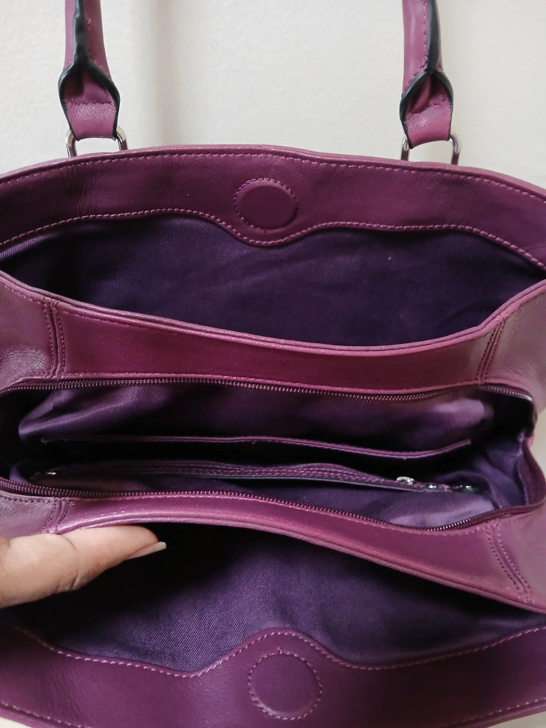 Gorgeous purple danier leather tote bag. Features silver-toned hardware. Zipper closure and interior pockets. Two carrying handles. Excellent for everyday use. price is firm plz. pick up midland and Danforth or 401 bay street or stc mall or Kennedy stn or runnymede stn