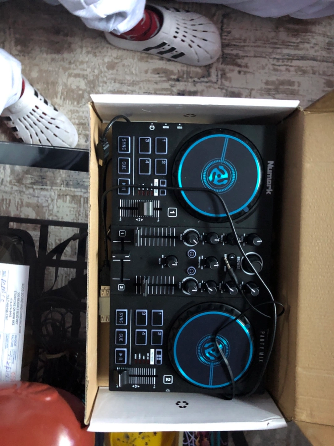 Numark Party Mix DJ controller. In box, looks new. Includes cables. Great for beginners.