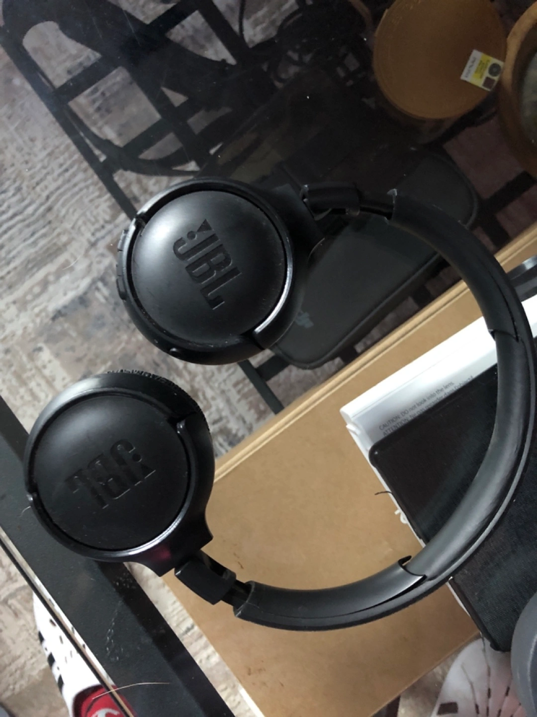 Black wireless headphones. Good for listening to music. Minor wear and tear.
