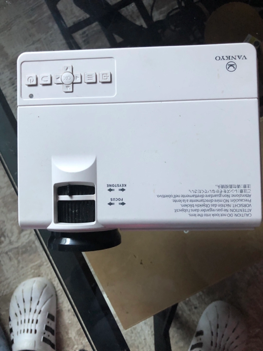 Portable projector. Features focus and keystone adjustment. Includes controls on top.