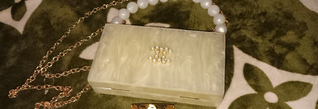 Beautiful mother of pearl look resin clutch. Features a gold chain strap and pearl accents. Chanel-inspired logo. Perfect for evening events.