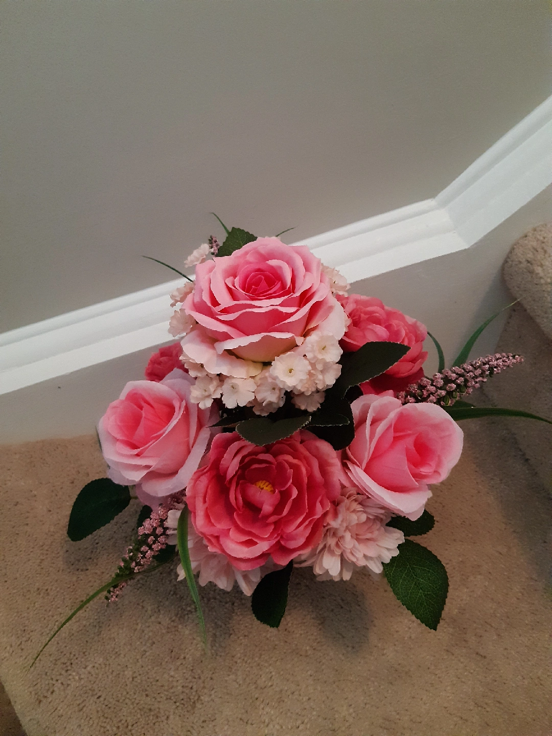 Add a touch of elegance to any room with this charming used floral arrangement, featuring a beautiful array of pink roses and delicate accents. This piece brings a fresh and inviting atmosphere, perfect for a side table or as a centrepiece.