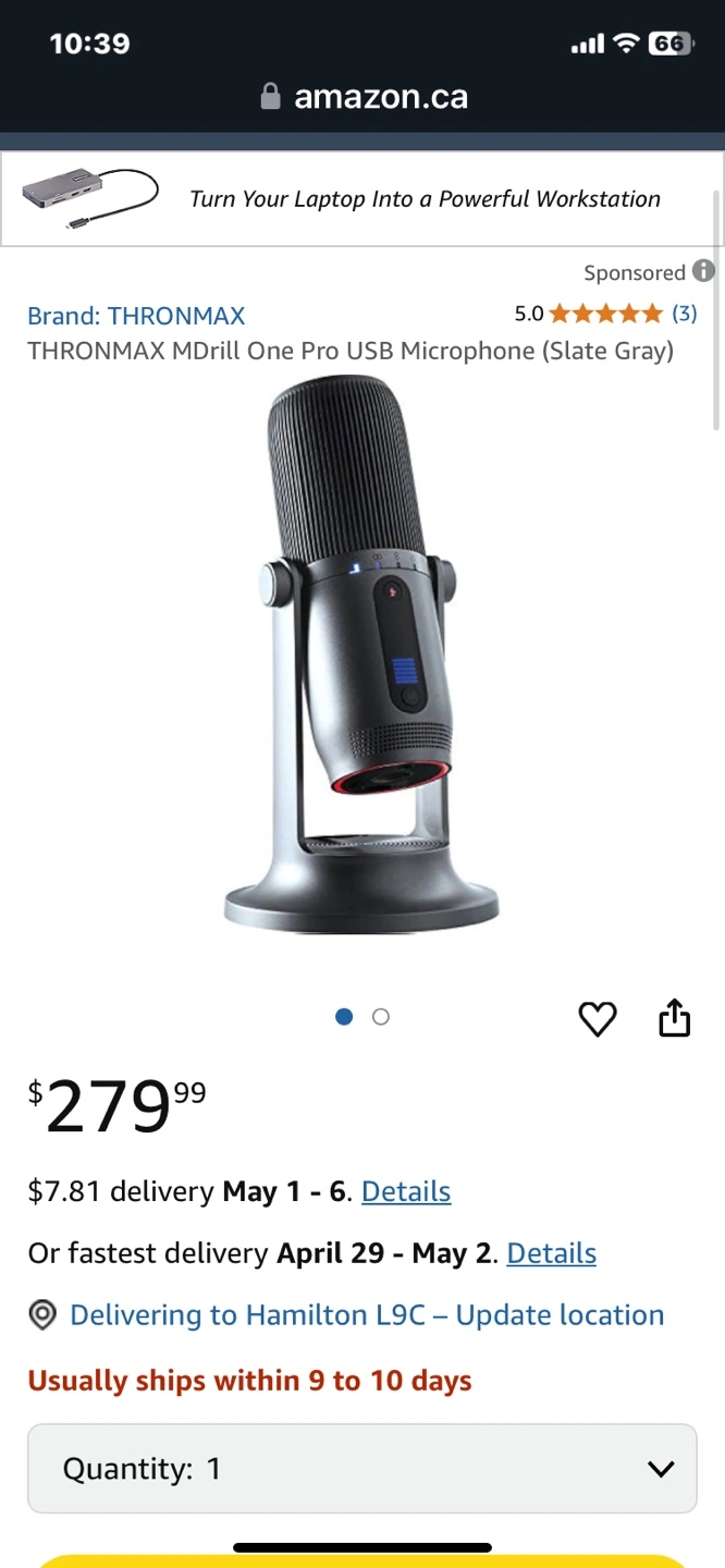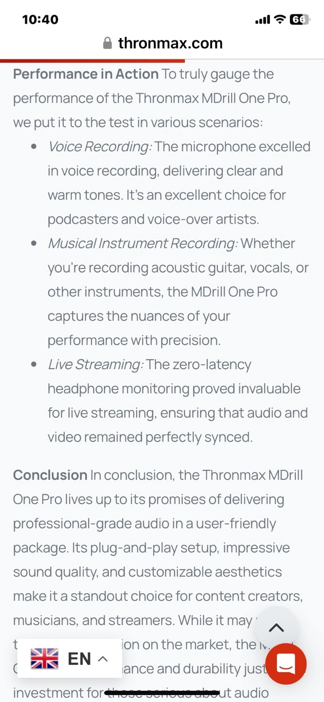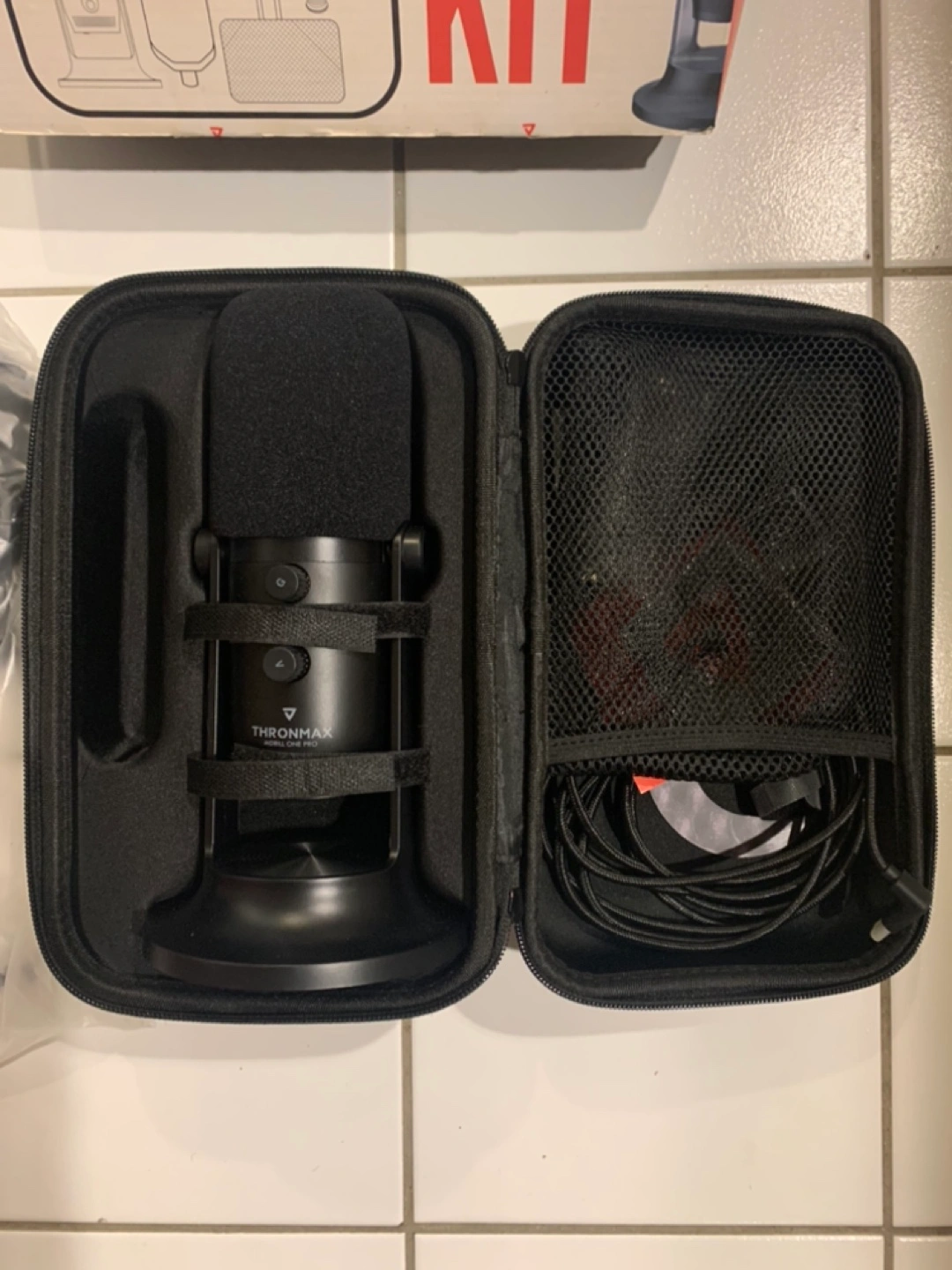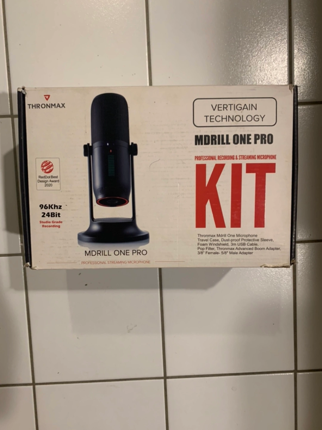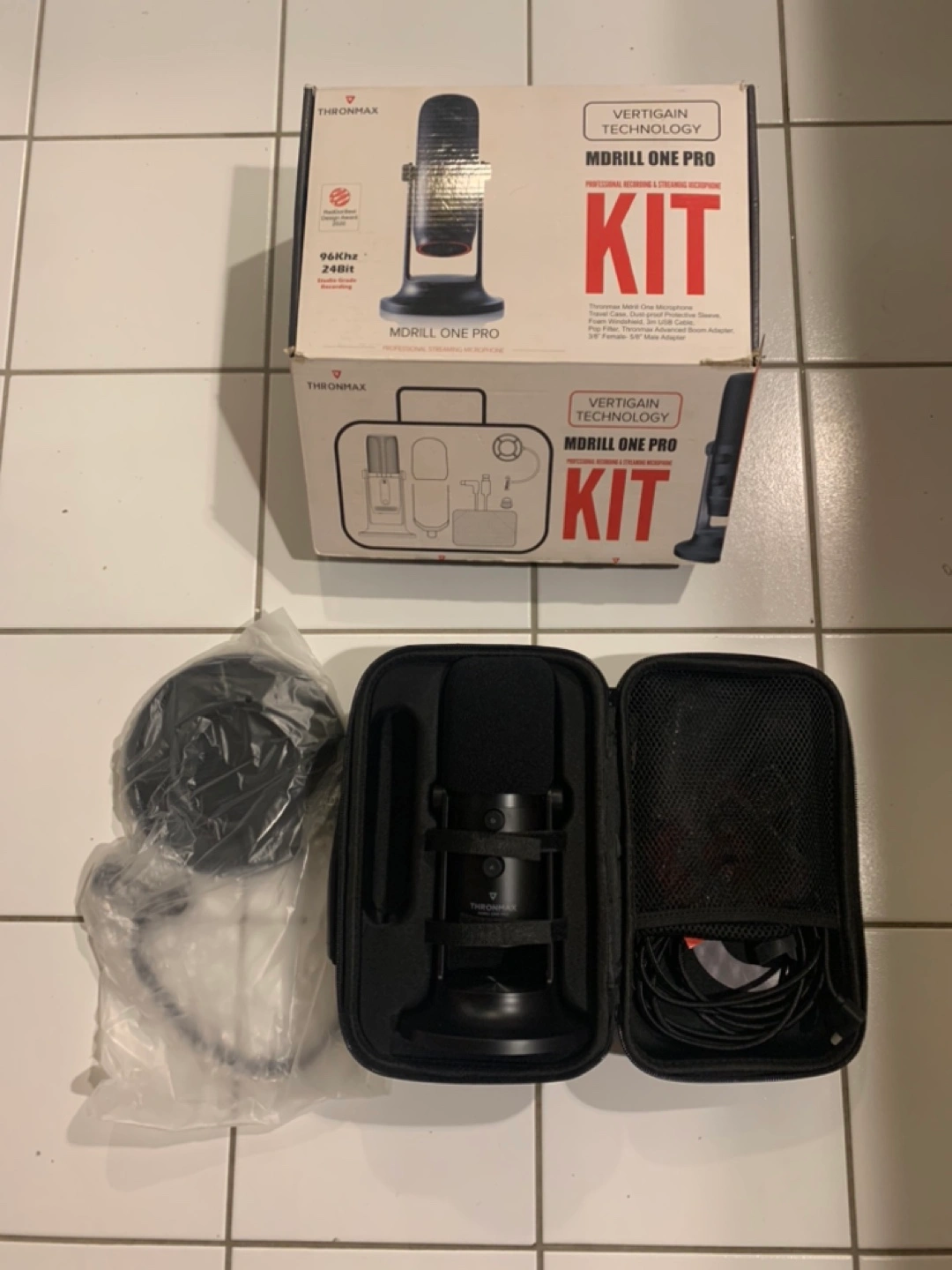 New, unopened Thronmax MDrill One Pro microphone kit. Includes microphone, shock mount, pop filter, carrying case, USB cable, and accessories. High-quality recording and streaming microphone. Perfect for content creators and streamers.