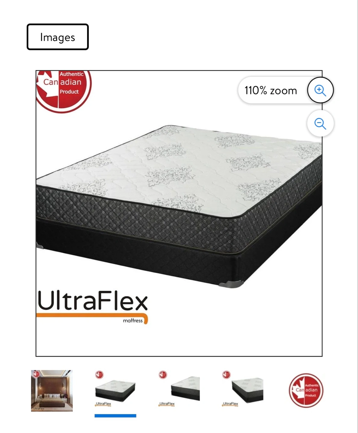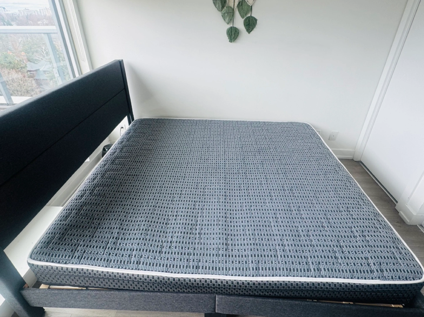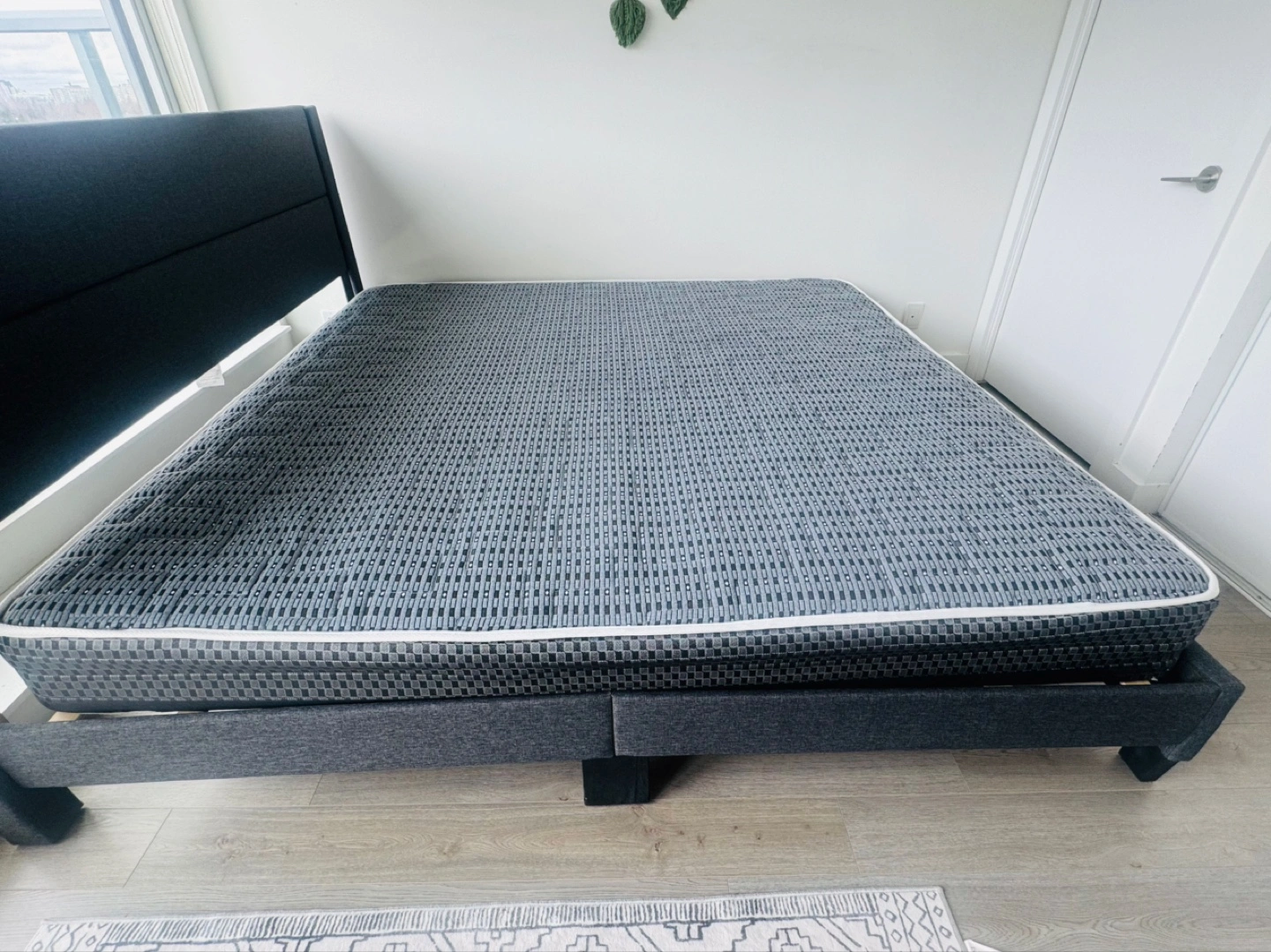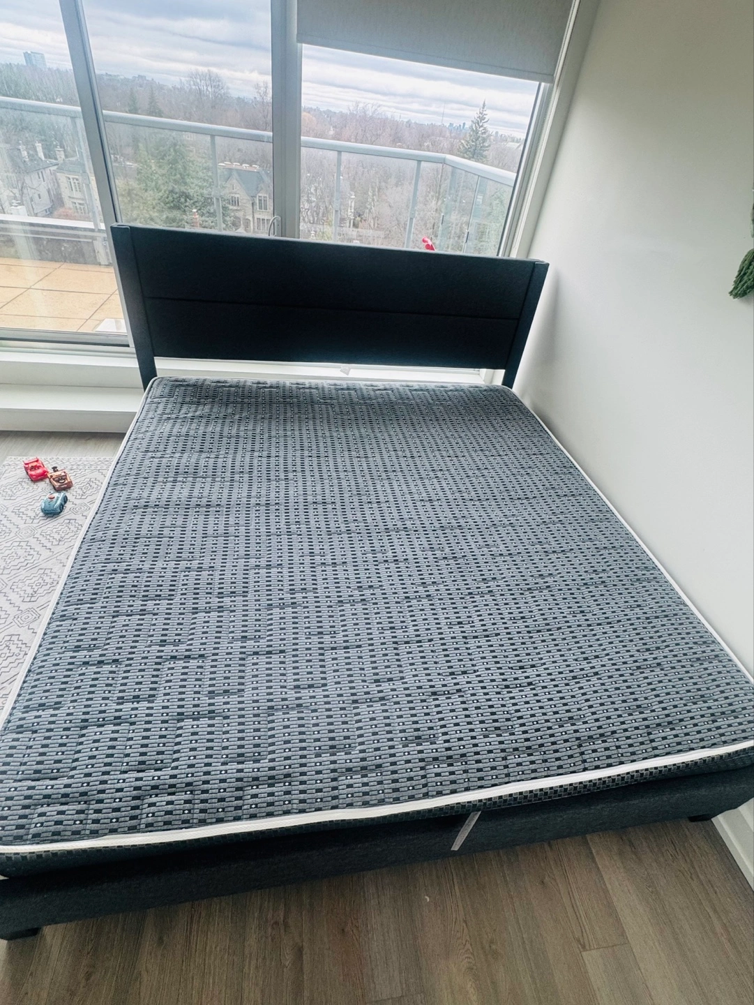 King size mattress. Grey and white patterned fabric. Includes frame. Very good condition no stain .no small . Pet and smoke free home.