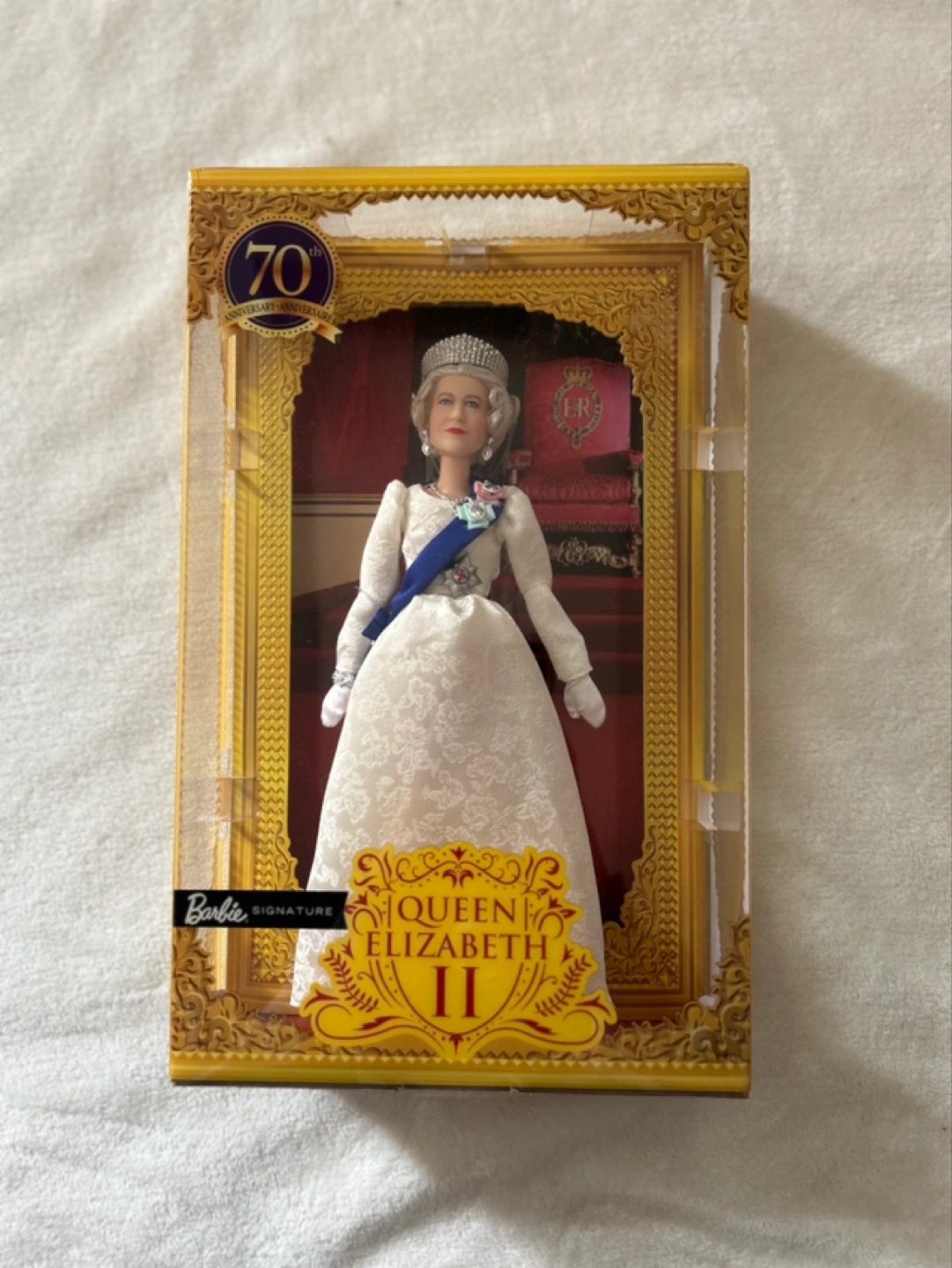 Collectible Barbie doll. Queen Elizabeth II Platinum Jubilee. 70th Anniversary. In original box. Elegant gown and crown. Asking what I paid originally