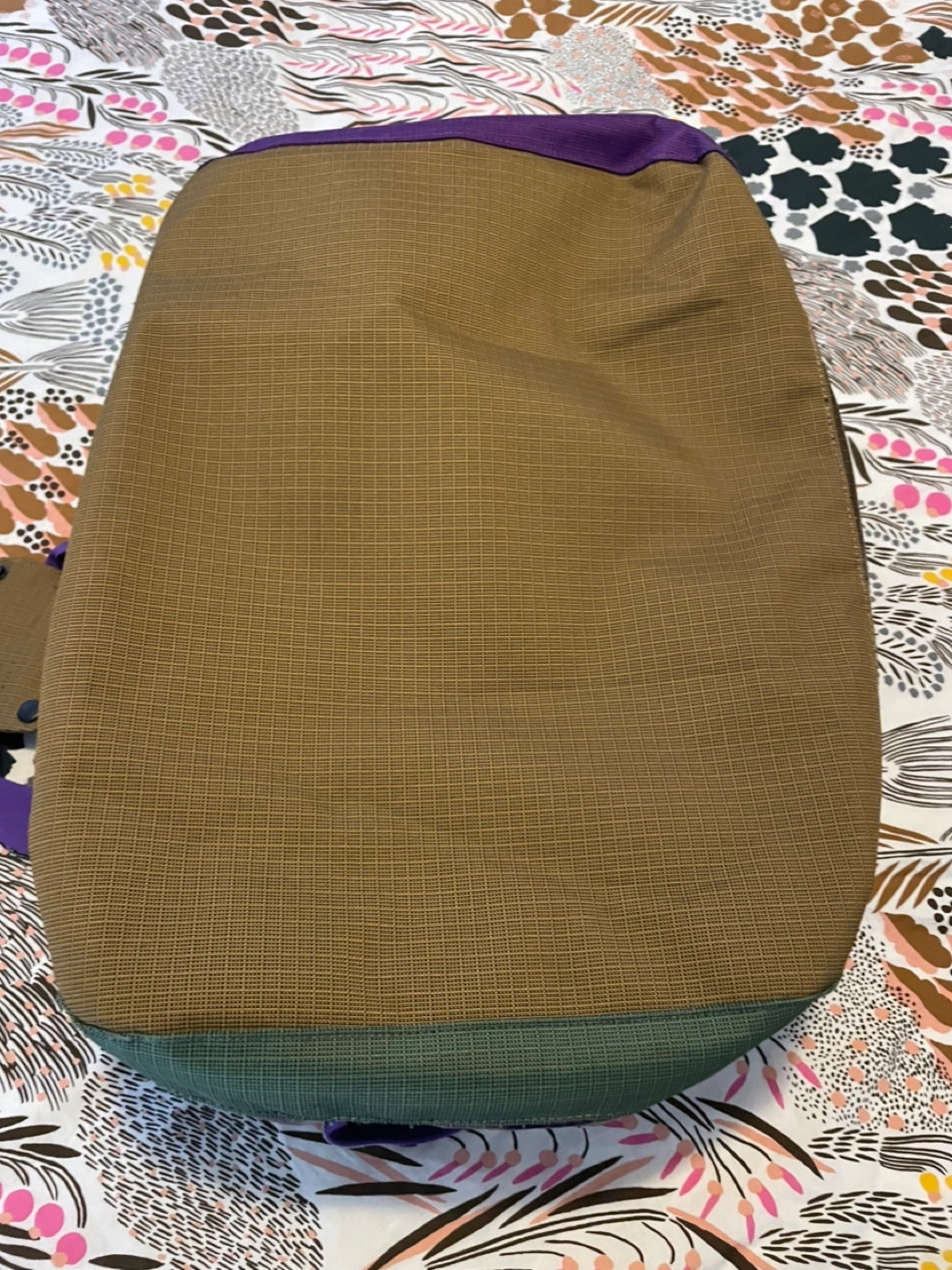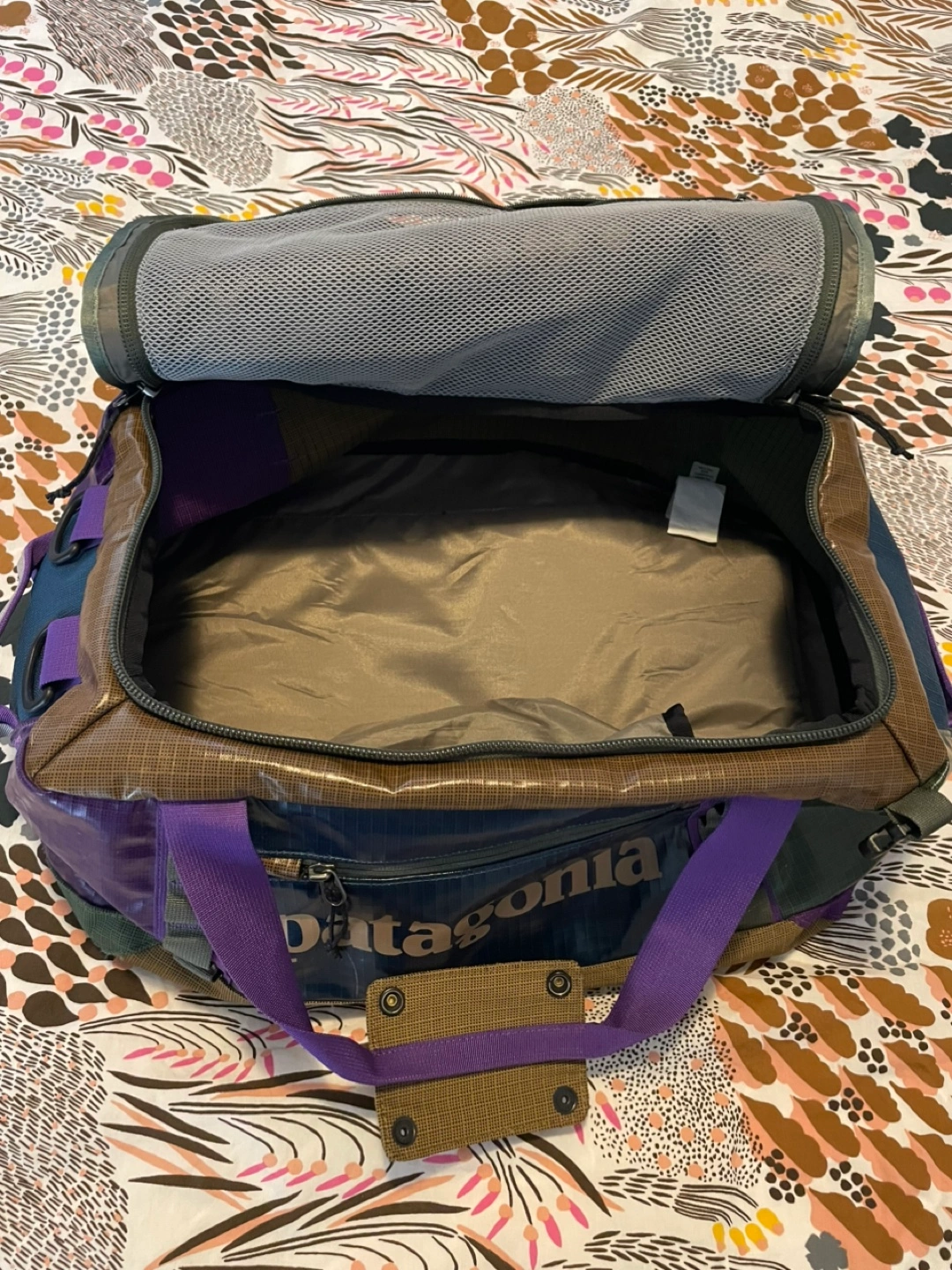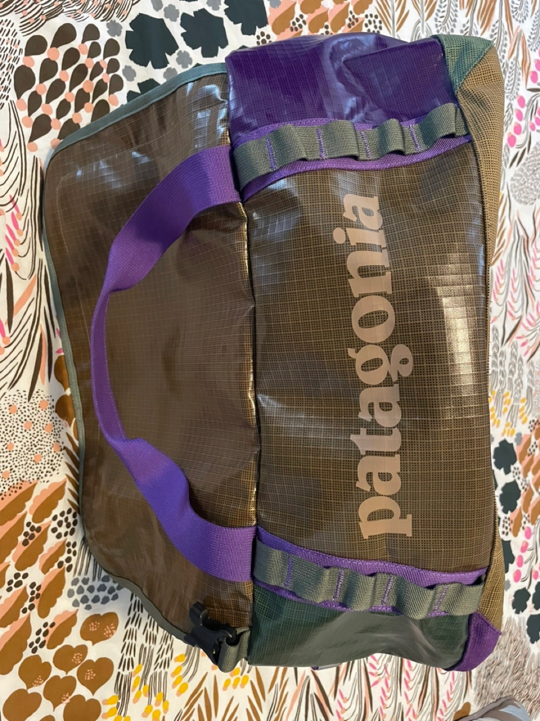 Large Patagonia duffle bag. Durable, water-resistant material. Multiple pockets and compartments. Purple and brown colour scheme. Great for travel or weekend trips. No flaws; upgrading to a bigger size.
