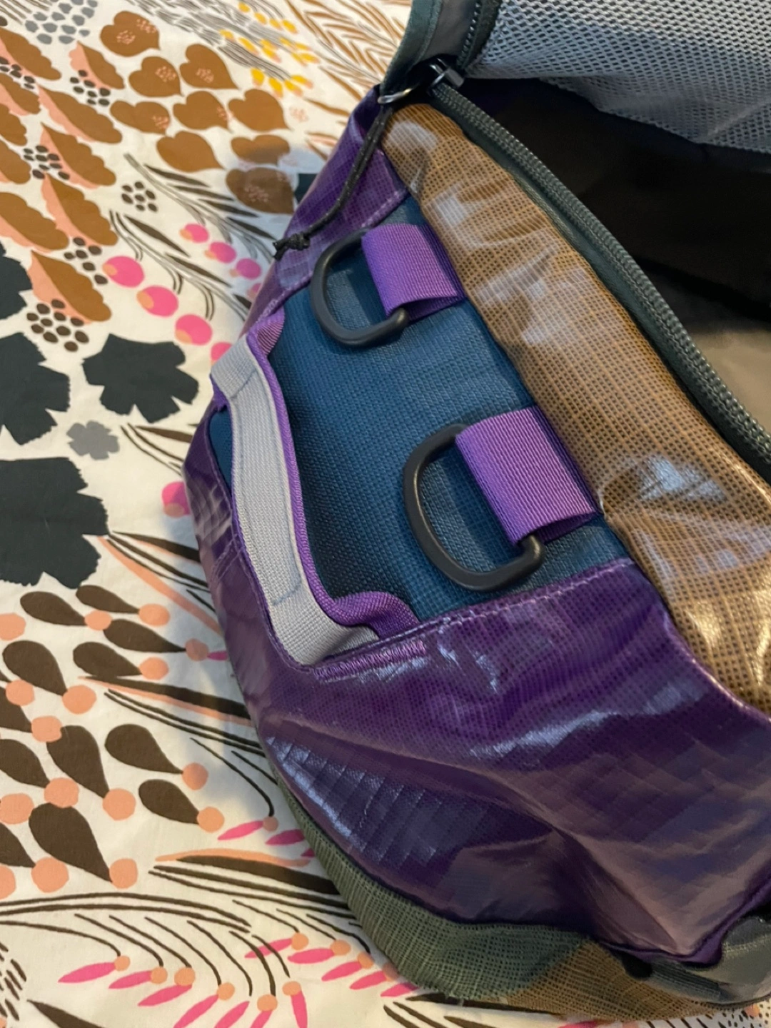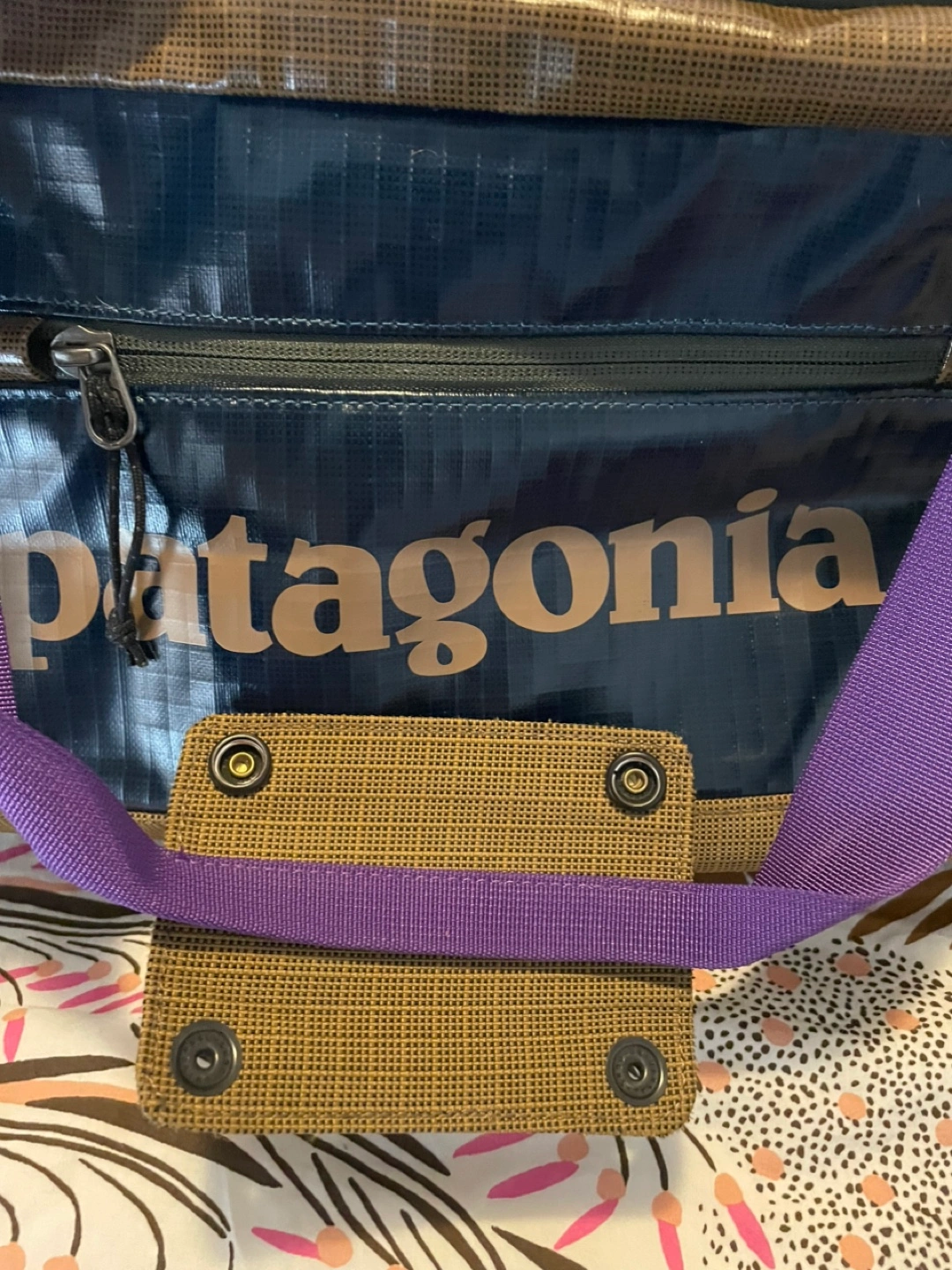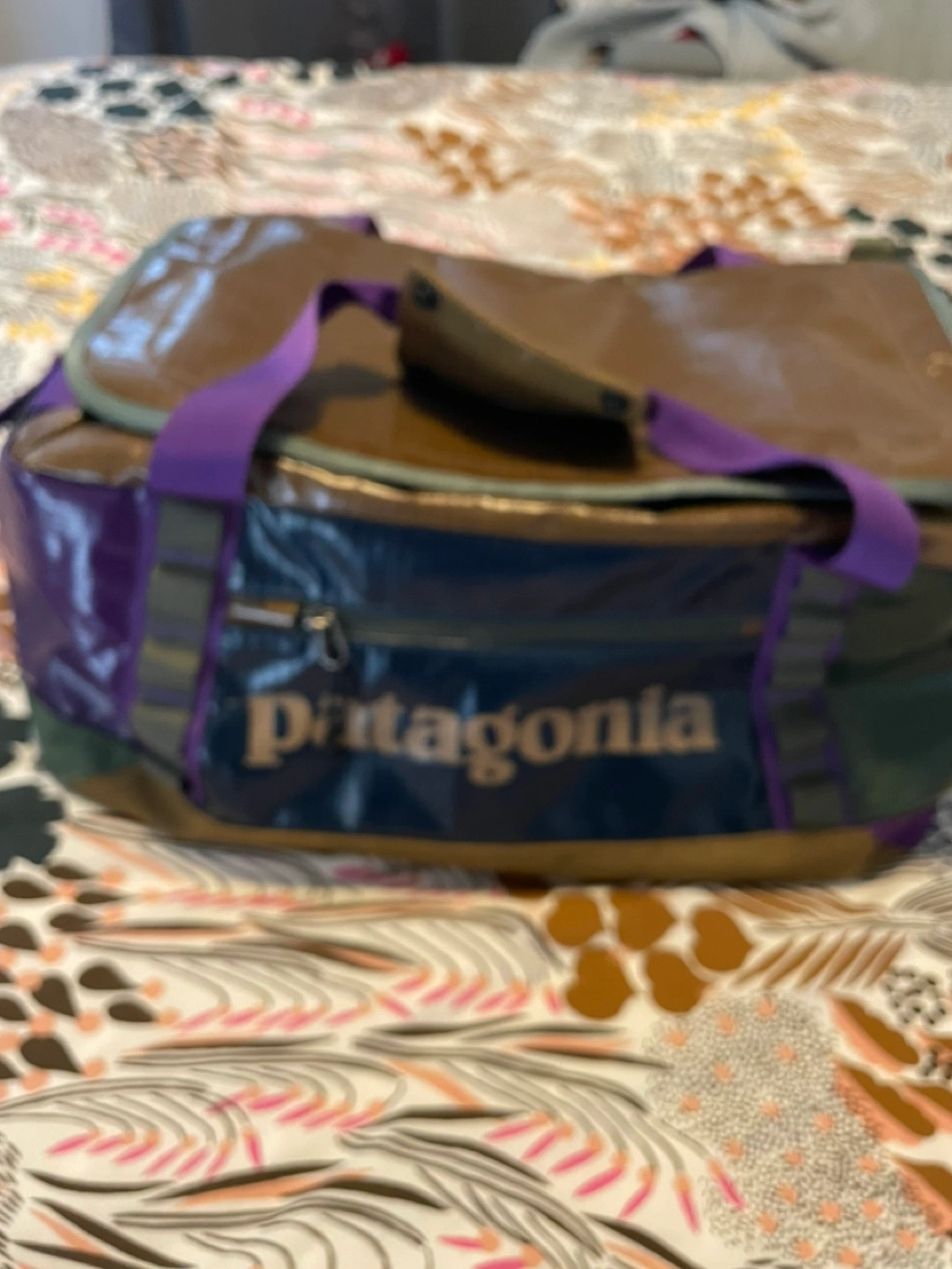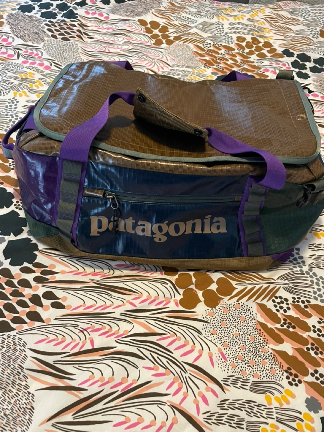 Large Patagonia duffle bag. Durable, water-resistant material. Multiple pockets and compartments. Purple and brown colour scheme. Great for travel or weekend trips. No flaws; upgrading to a bigger size.