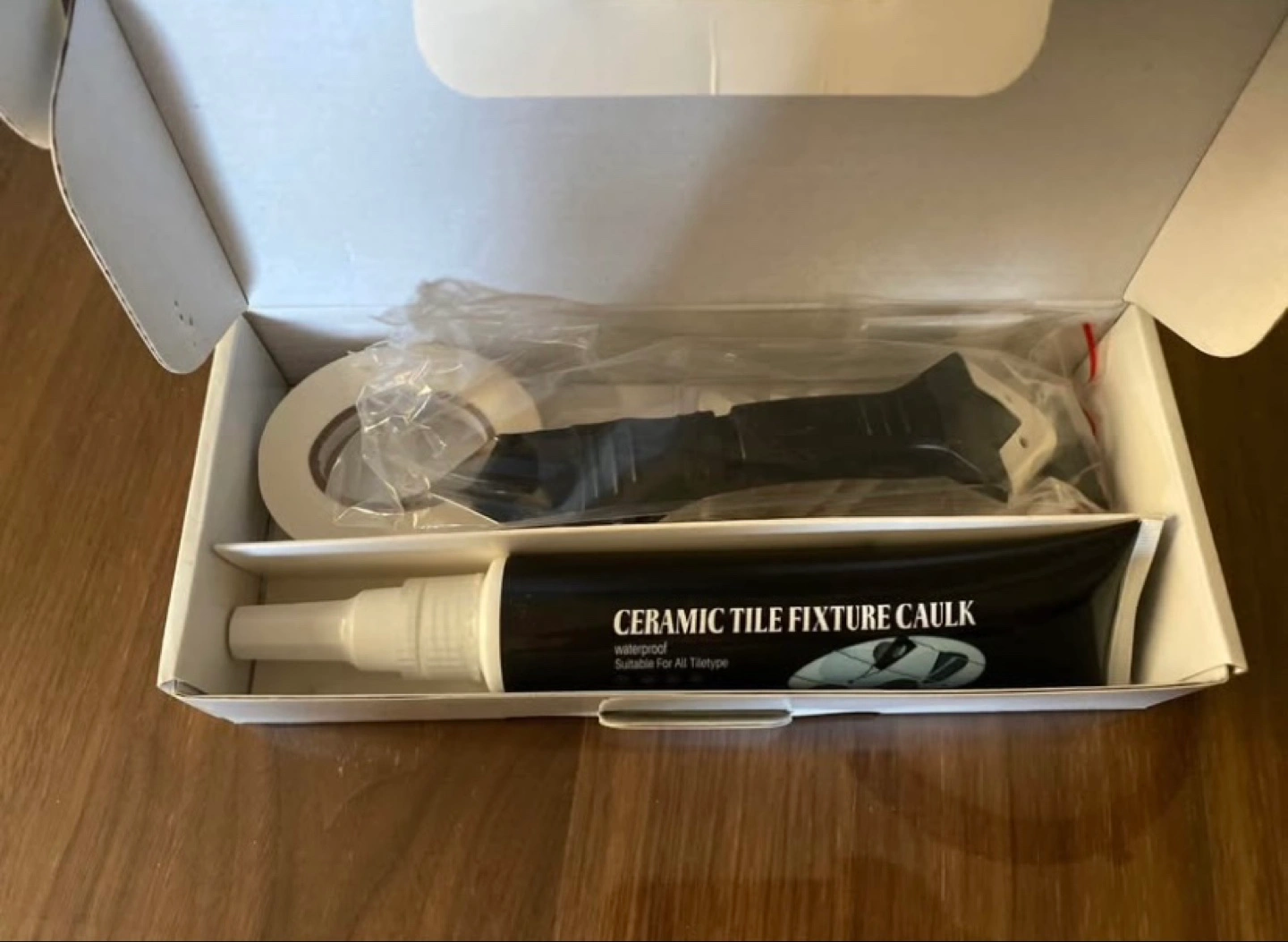 Repair kit for shower, bathtub, sink, bath, bathroom, pool, windows or all tiles. Includes waterproof caulk, tape and scraper. Quick drying and convenient. Water-based formula. Made in China.