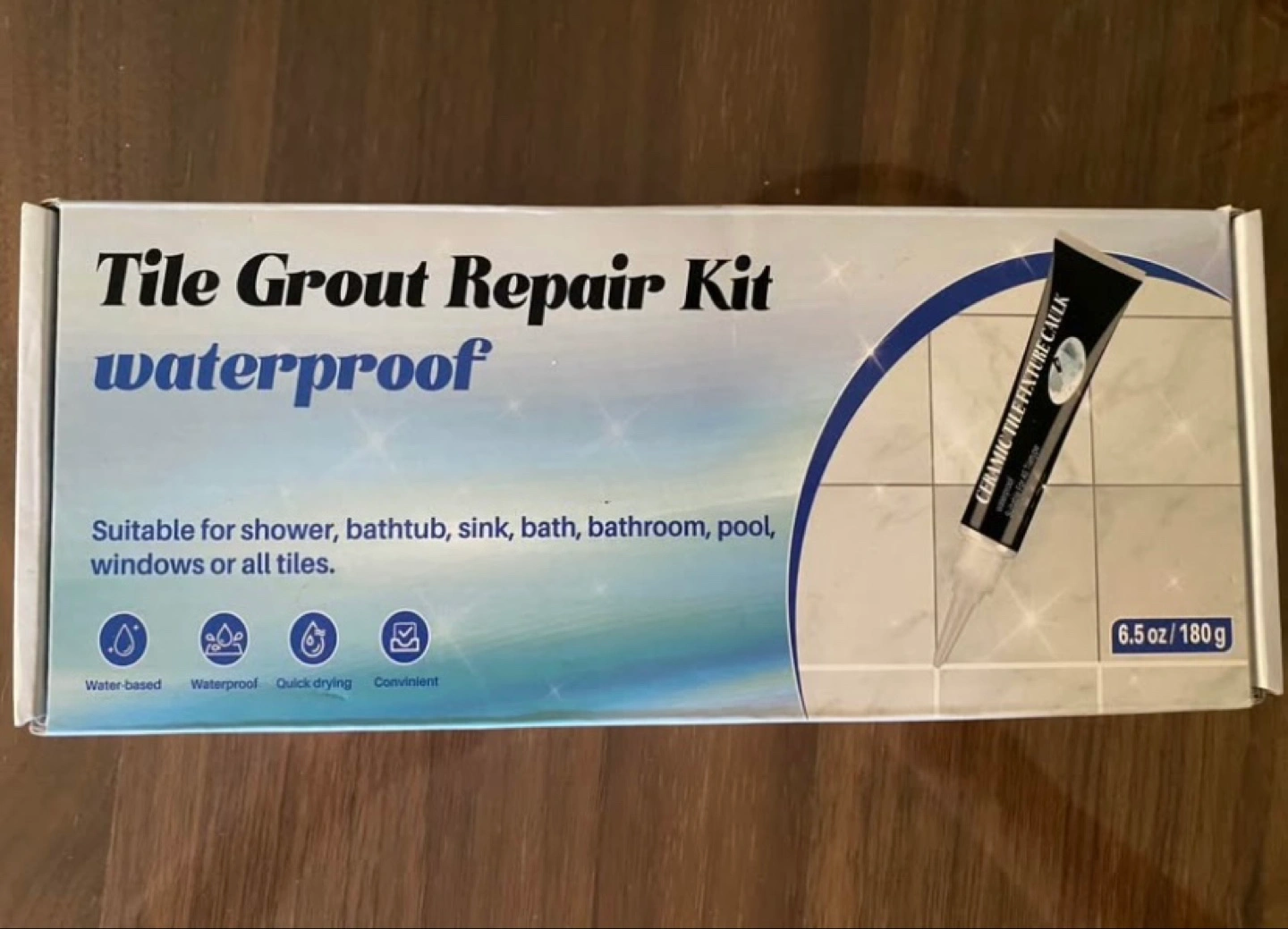 Repair kit for shower, bathtub, sink, bath, bathroom, pool, windows or all tiles. Includes waterproof caulk, tape and scraper. Quick drying and convenient. Water-based formula. Made in China.