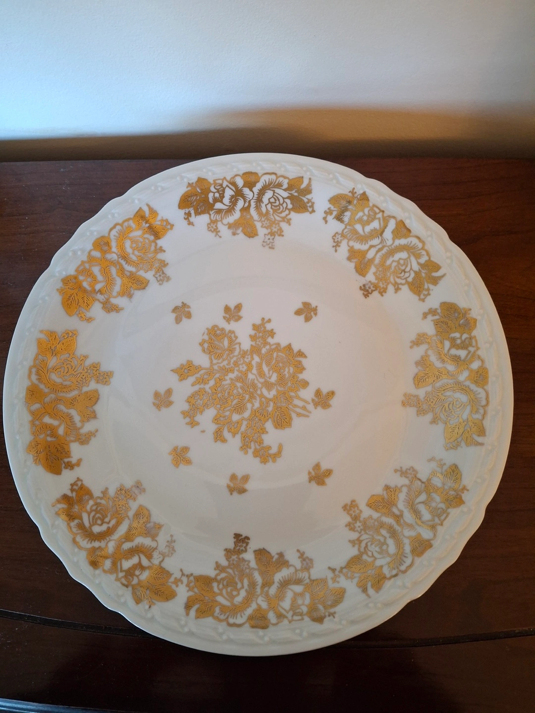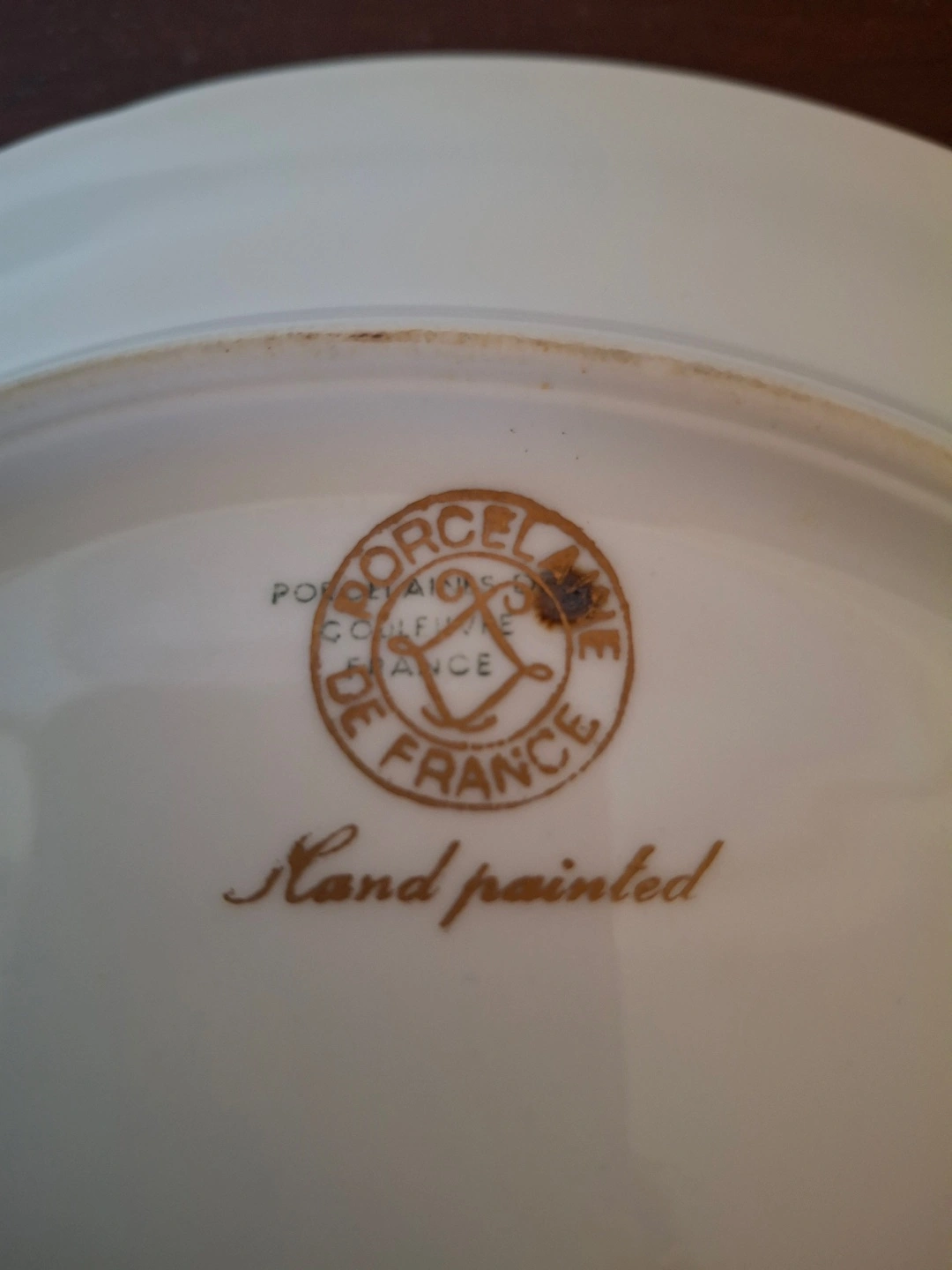1000+Elegant porcelain plate. Features a beautiful gold flower design. Hand-painted detail. Scalloped edge. Made in France. Excellent condition. 9.25” round. Perfect for serving or display. Available for pickup in Markland Wood.