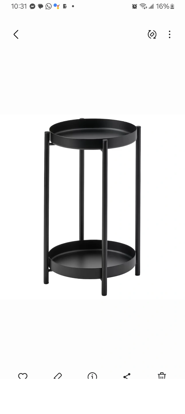 Two-tiered plant stand. Black metal frame. Round shelves. Simple design. Great for indoor plants.