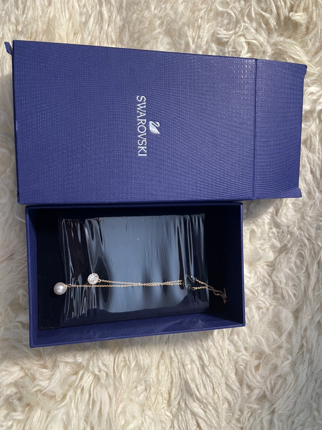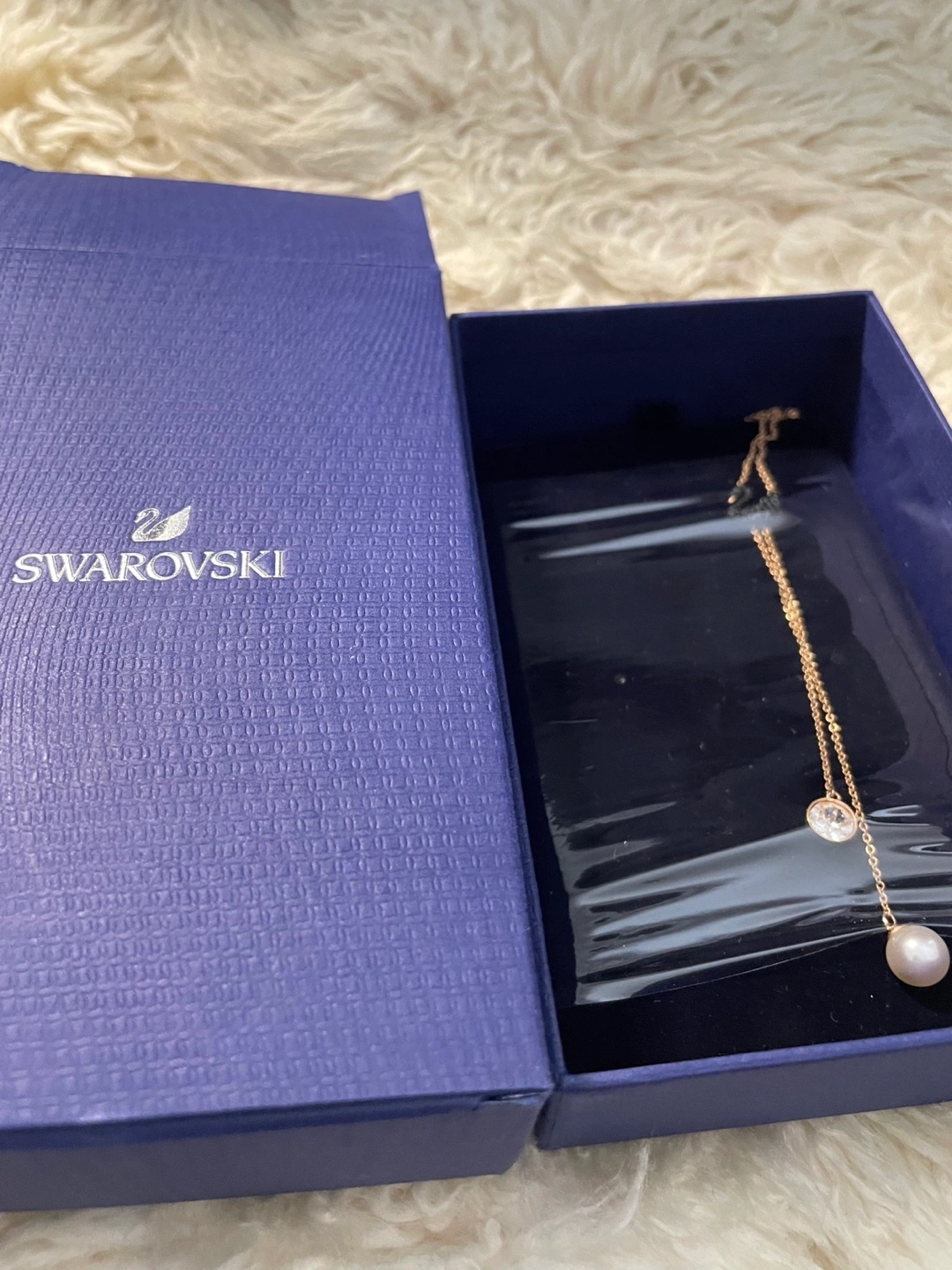 Gorgeous Swarovski necklace. Features a delicate gold chain, sparkling crystal, and a beautiful pearl. Comes in original box. Perfect gift or treat yourself.