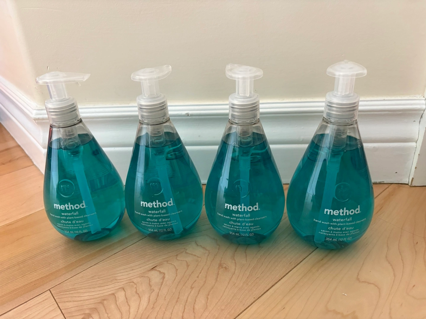 Set of four Method hand wash bottles. Waterfall scent. Plant-based cleansers.