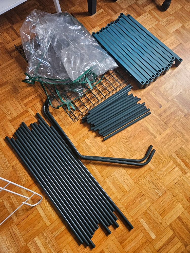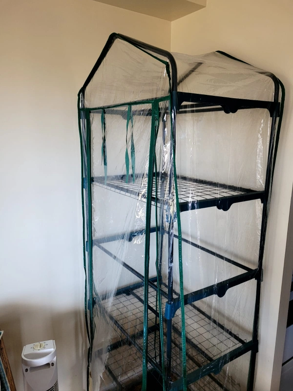 Indoor greenhouse. Four shelves, dark green metal frame, clear plastic cover. Great for starting seeds or propagating plants.