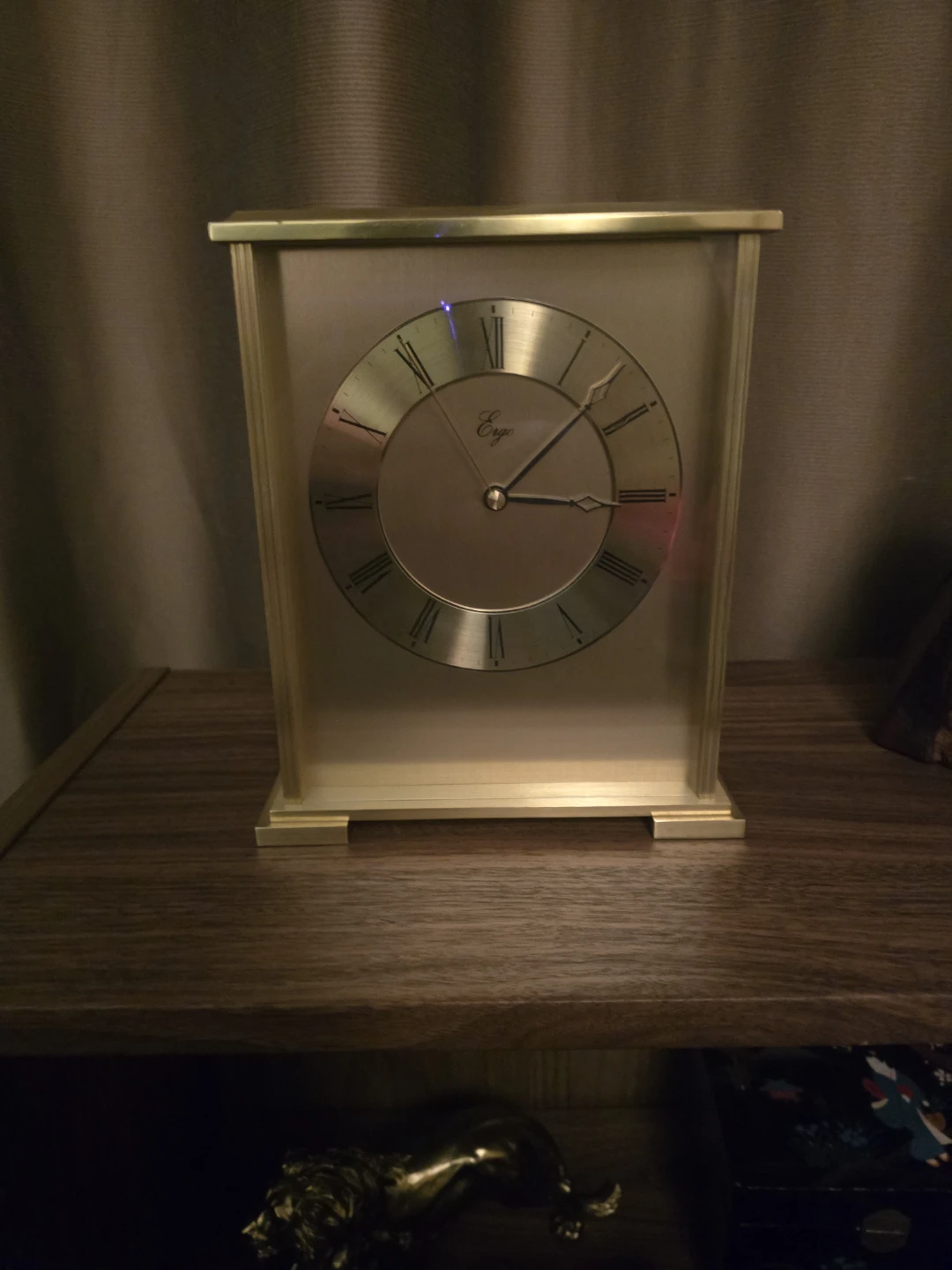 Elegant Ergo mantel clock with a brass finish. Features Roman numerals and a clear glass face. Takes one AA battery.