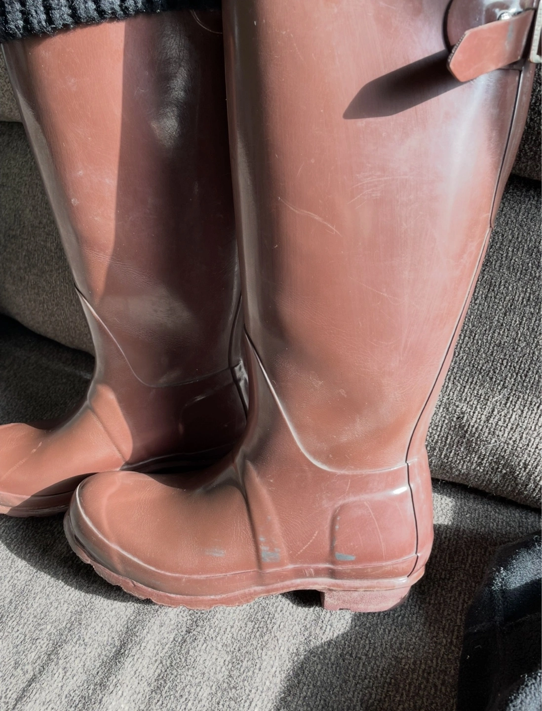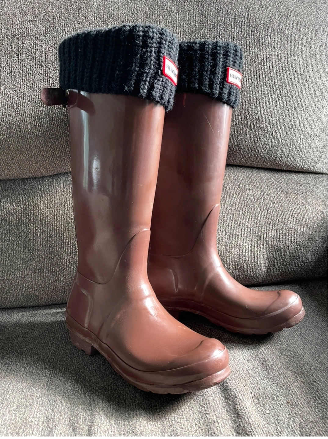 Glossy brown size 6, with socks. Have some wear and tear but still lots of life in them, I got a new pair! Great for country fest, fishing, hunting,quadding etc.