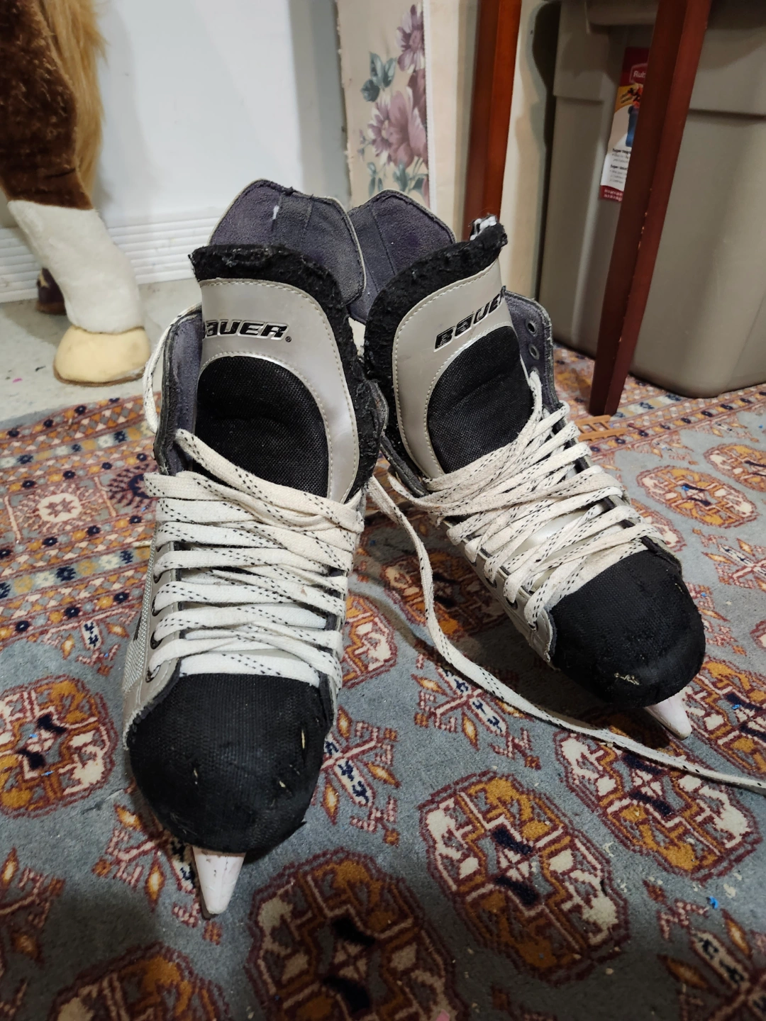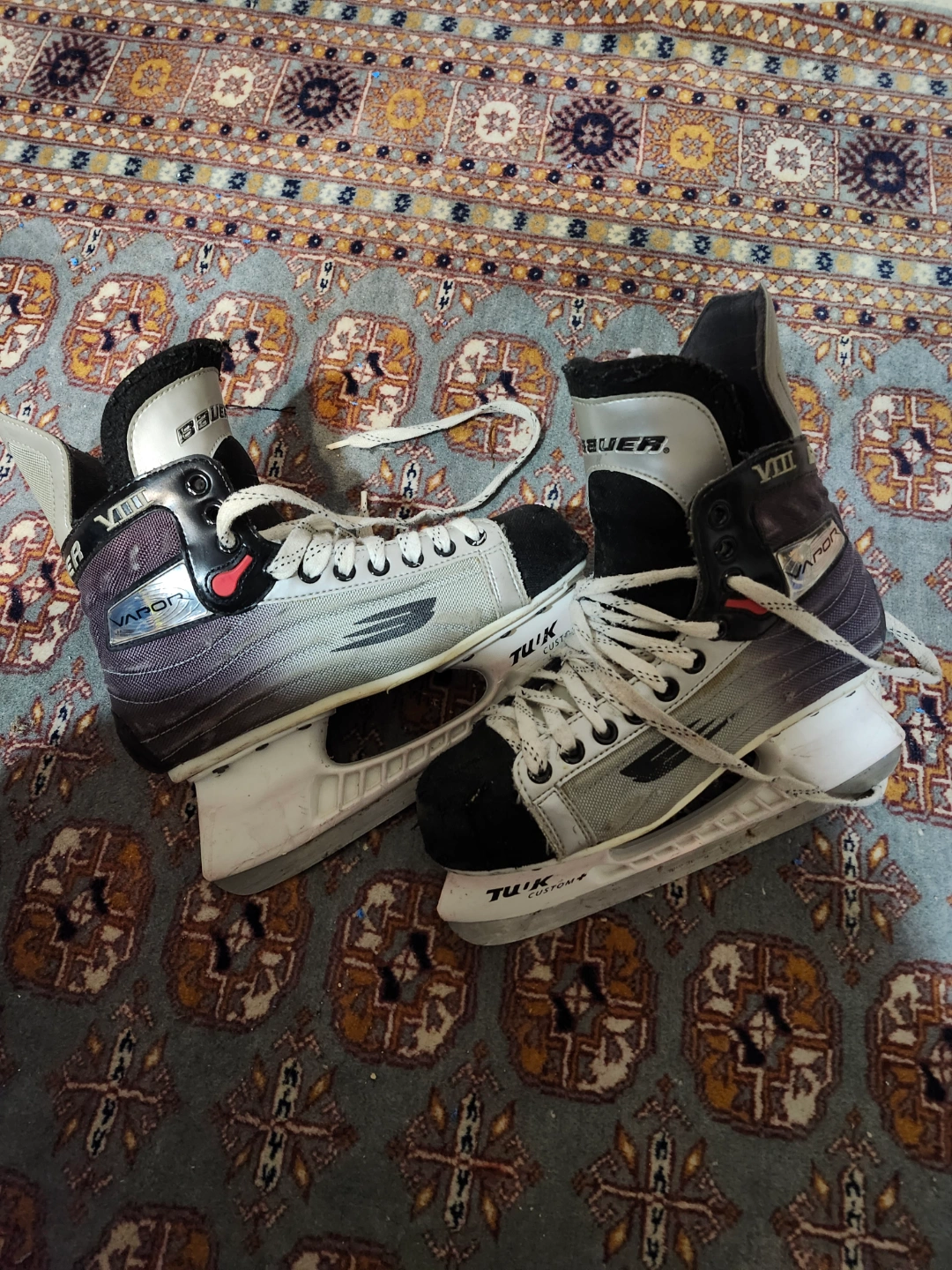 Used Bauer Vapor X700 youth ice skates. Minor wear and tear. Good condition for their age. Great for recreational use. Unsure of size but approximately size 5 or 6.