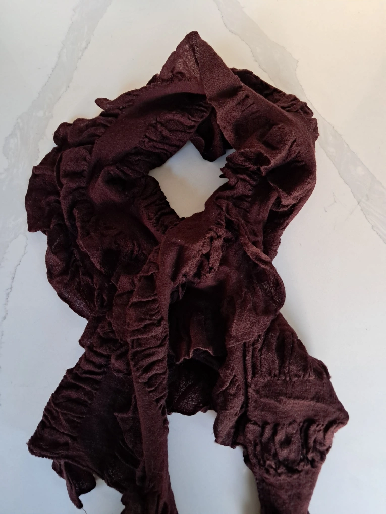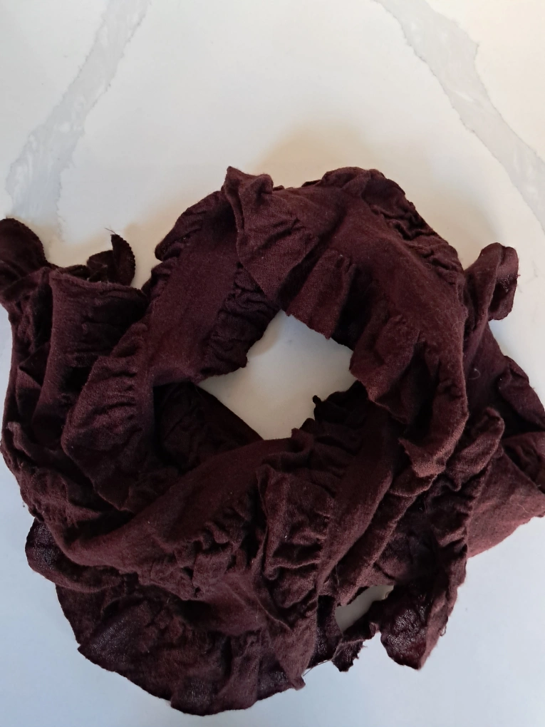 1000+Soft, dark brown, ruffled fabric scarf. Lightweight and comfortable. Great for adding a touch of elegance to any outfit.